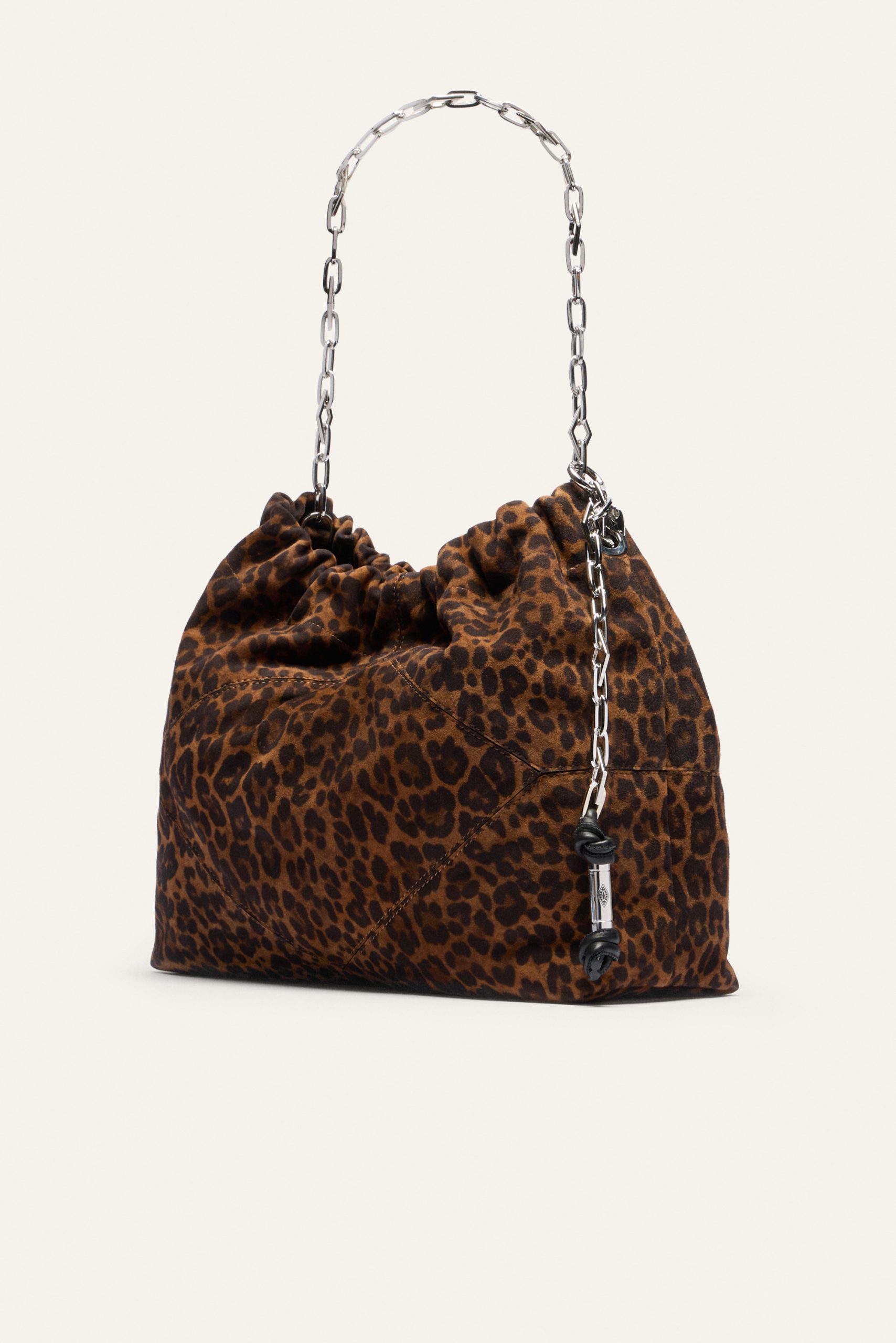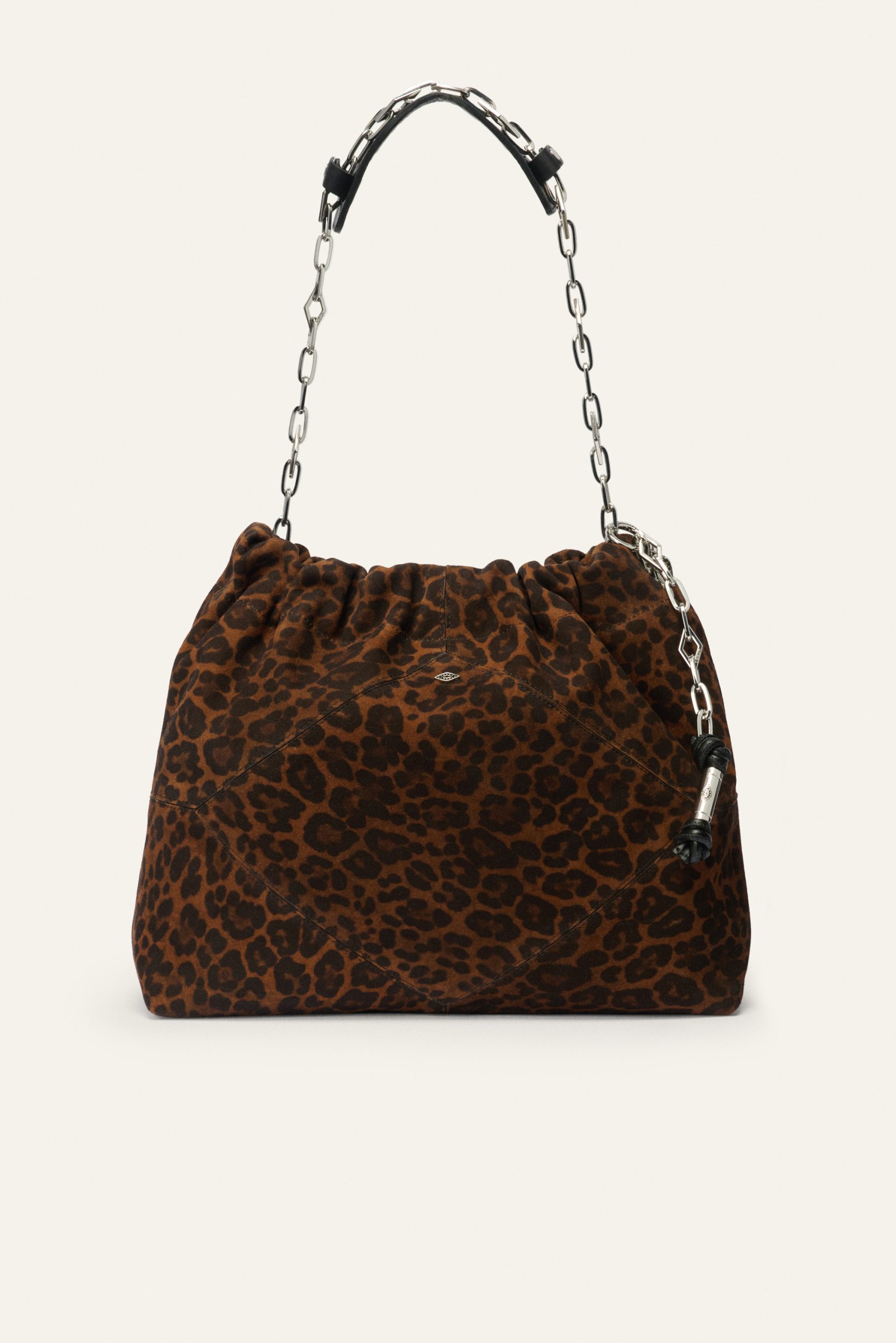 – Large model – Pleated details on the top- Soft material- Antique gold- or silver-colored brass tubes developed especially for ba&sh- Diamond metal chain on the shoulder- Many artisanal details- Signature diamond-shaped cutouts at the front- Double shoulder strap- Hand-braided strings- Diamond-shaped topstitching- Carried by hand, on the shoulder or across the body- Dimensions : 35x 45 x 13 – Strap amovible – Made in Italy- Material: Italian leather from tanneries audited by the Leather Working Group with mineral tanning