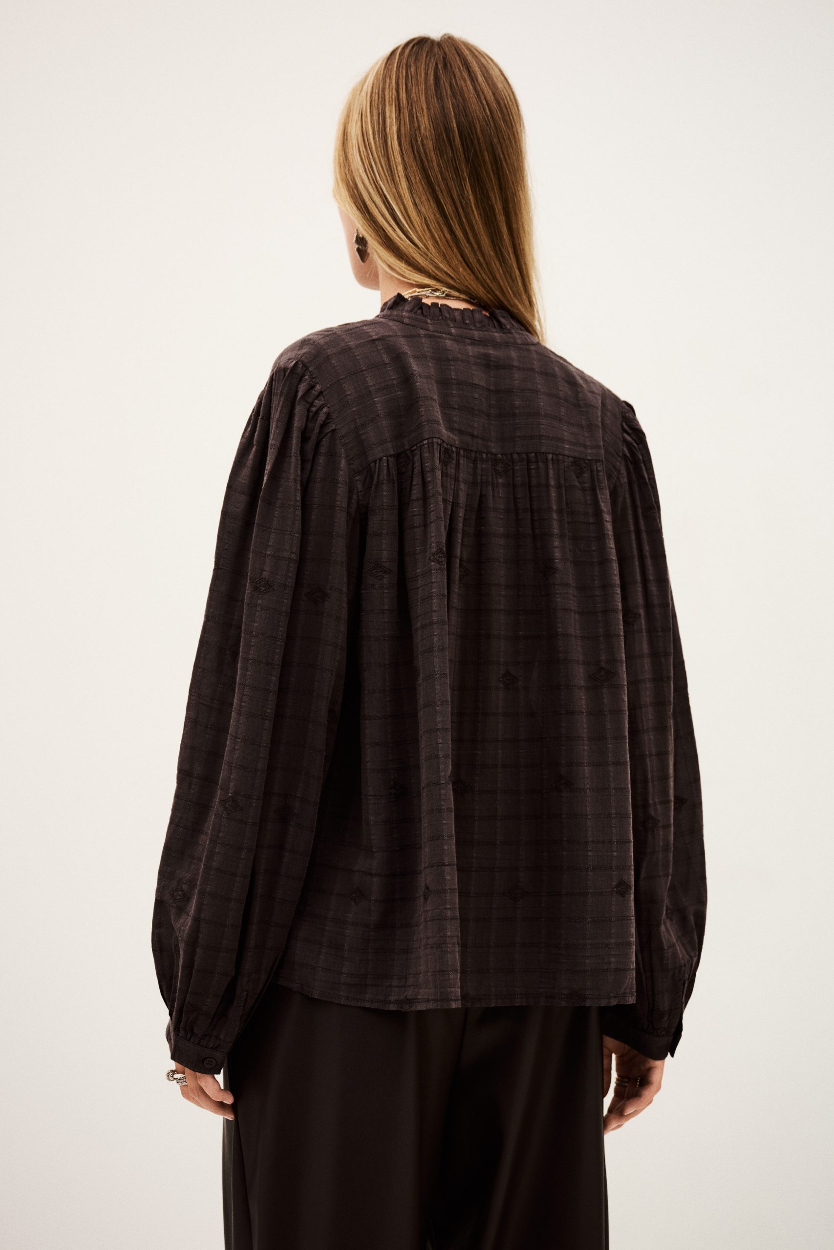 – Frilly collar- Seams in front and back- Gathered details- Flowing material- Charming bohemian style- All-over embroidery detailing- Fine lace insert- Straight cutThe cotton fibers in this model come from organic farming.The viscose in this model is made from wood pulp from sustainably managed forests.