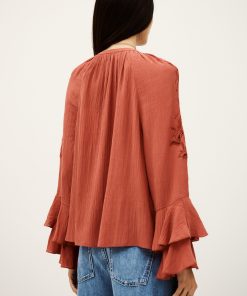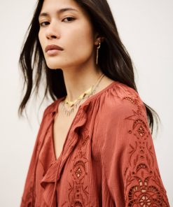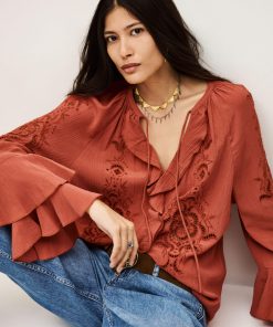 – Loose-fitting- Long sleeves- Frilly details- V-neckline- String ties- English embroideryThe viscose in this model is made from wood pulp from sustainably managed forests.