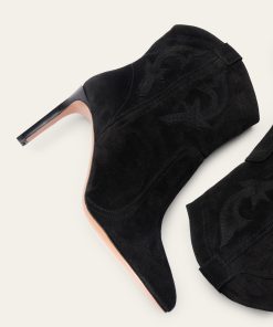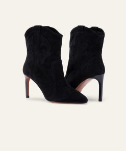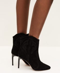 These heeled ba&sh ankle boots combine glamourous styling with American influences for an ultra-trendy look. Their pointy toe and stiletto heel flatter the figure while the cut out motifs and topstitching bring lots of originality. You’ll highlight these cowboy-inspired low boots wearing them with 7/8 length jeans or a skirt. – Suede ankle boots- High heel : 85 mm- Pointy toe- Matching topstitching- 100% suede