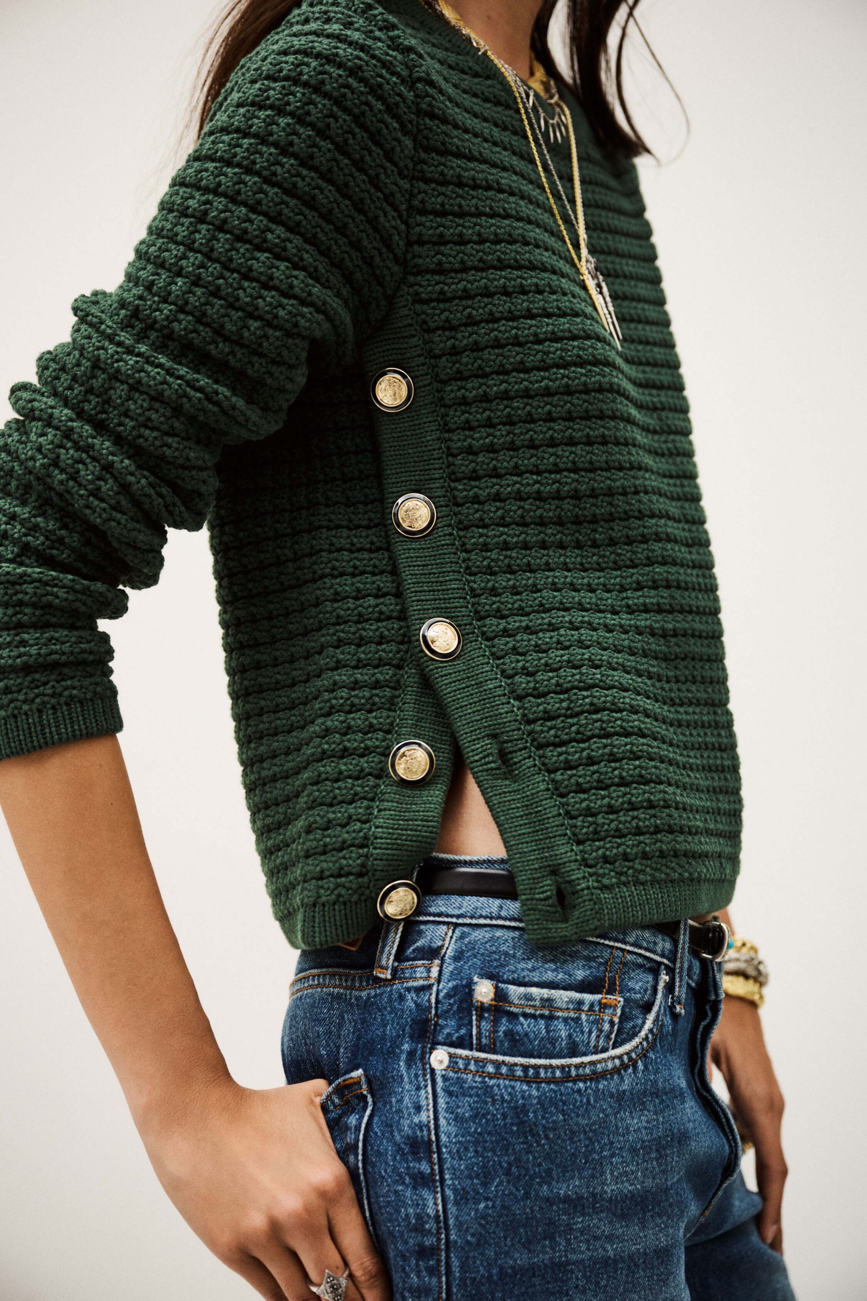 – Round neckline- Buttoned- Contrasting buttons- Textured details- Boxy cutThe cotton fibers in this model come from organic farming.