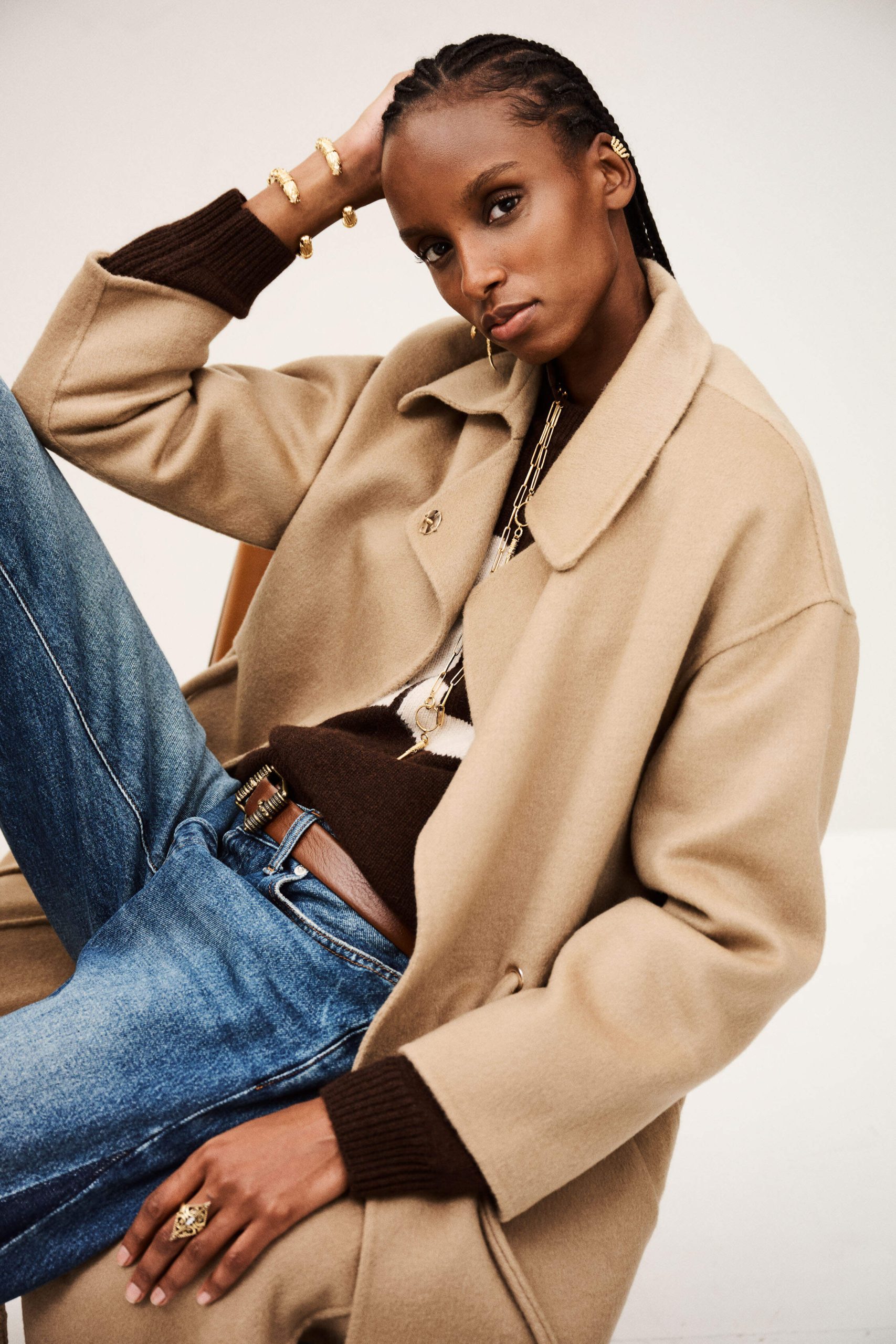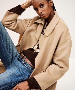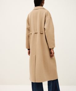 The ba&sh KATE coat is a key piece this season. This long coat has minimalist style, a shirt collar, slightly dropped shoulders, and piped pockets. It hits below the knees. It’s made in a double-sided wool clothand it has a tie belt in the same fabric that slips through golden grommets at the waist. A coat with chic and streamlined style that’s enhanced with a pretty feminine detail. This piece is crafted with LENZING ECOVERO viscose, a fiber made from wood pulp sourced from sustainably managed forests. LENZING and ECOVERO are trademarks of Lenzing. – Long coat- Shirt collar- No buttons- Tie belt- Back slit- 80% wool, 20% polyamide