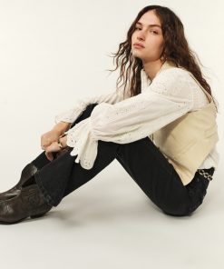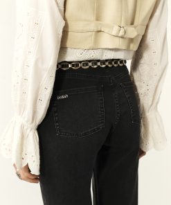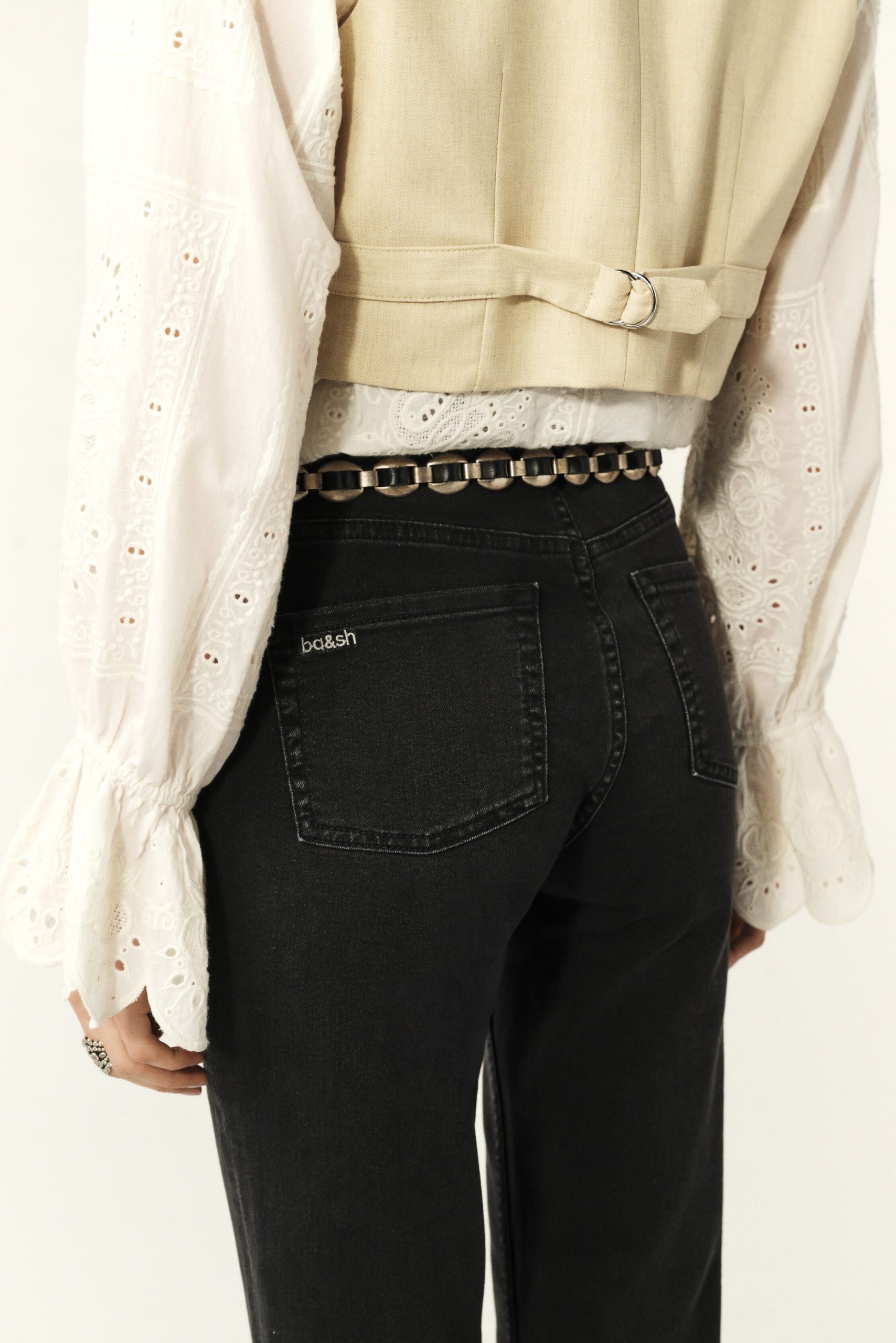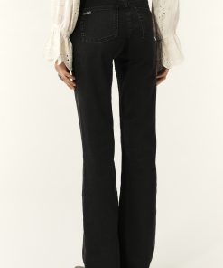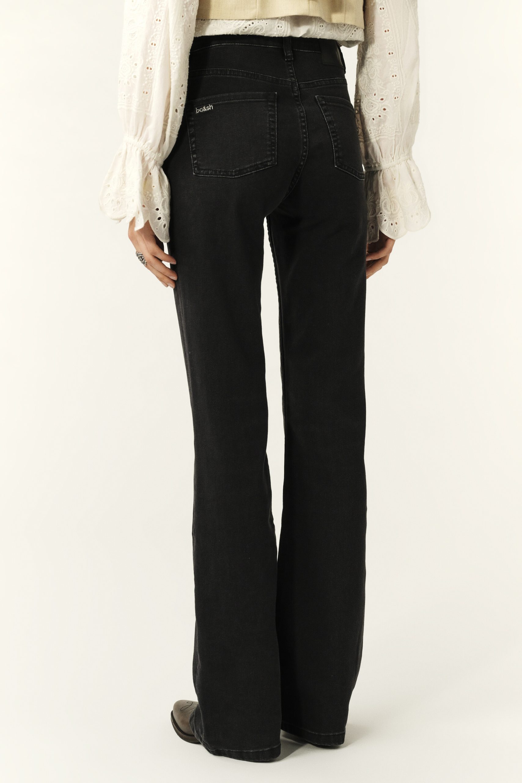 – Bootcut style- Medium-sized- 5 pockets- Zipper and button closure- Belt loops
