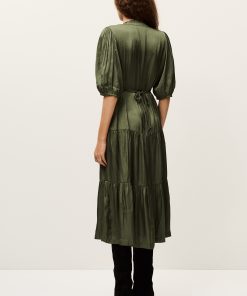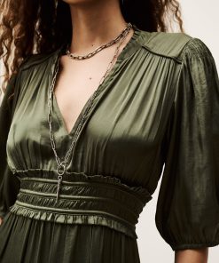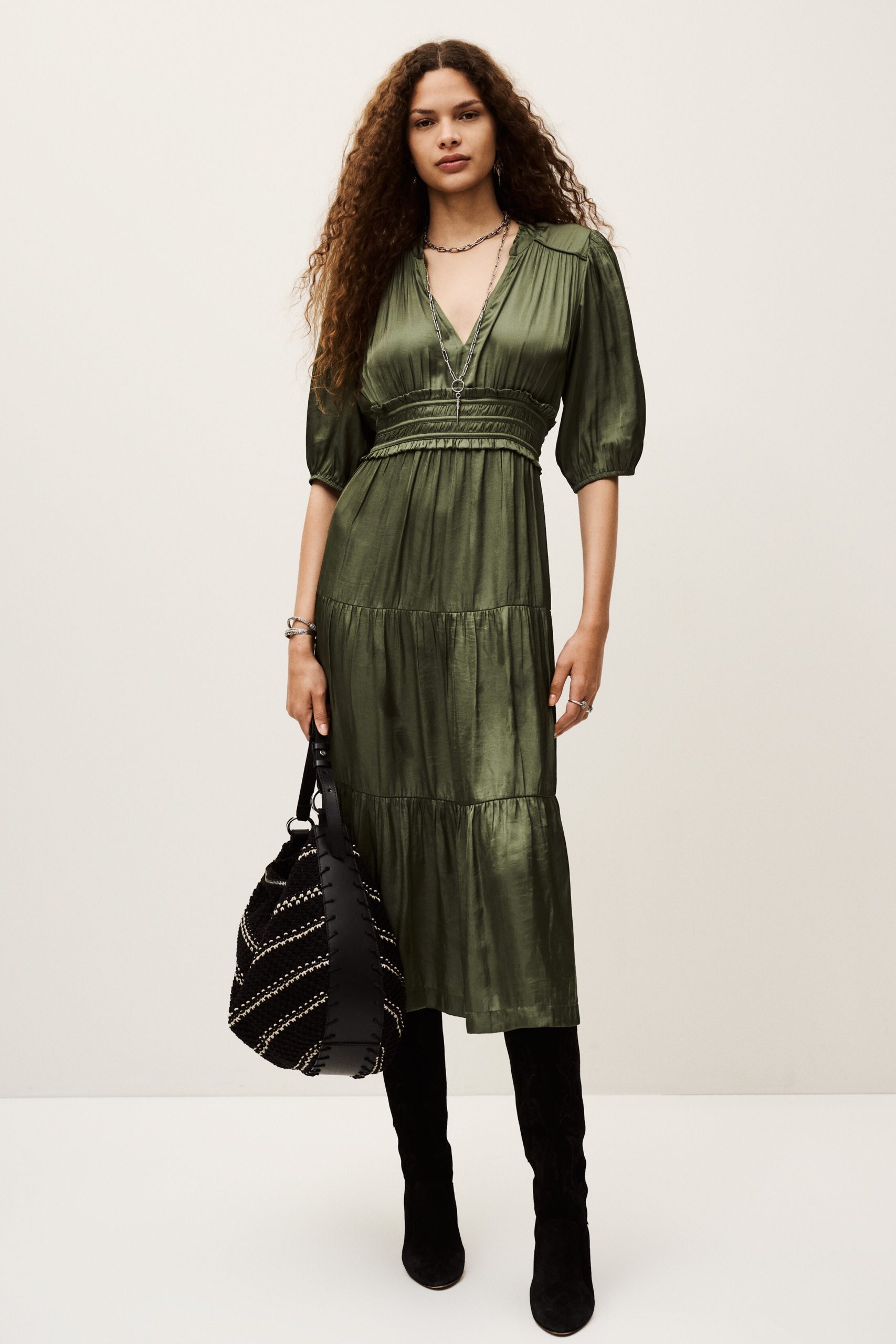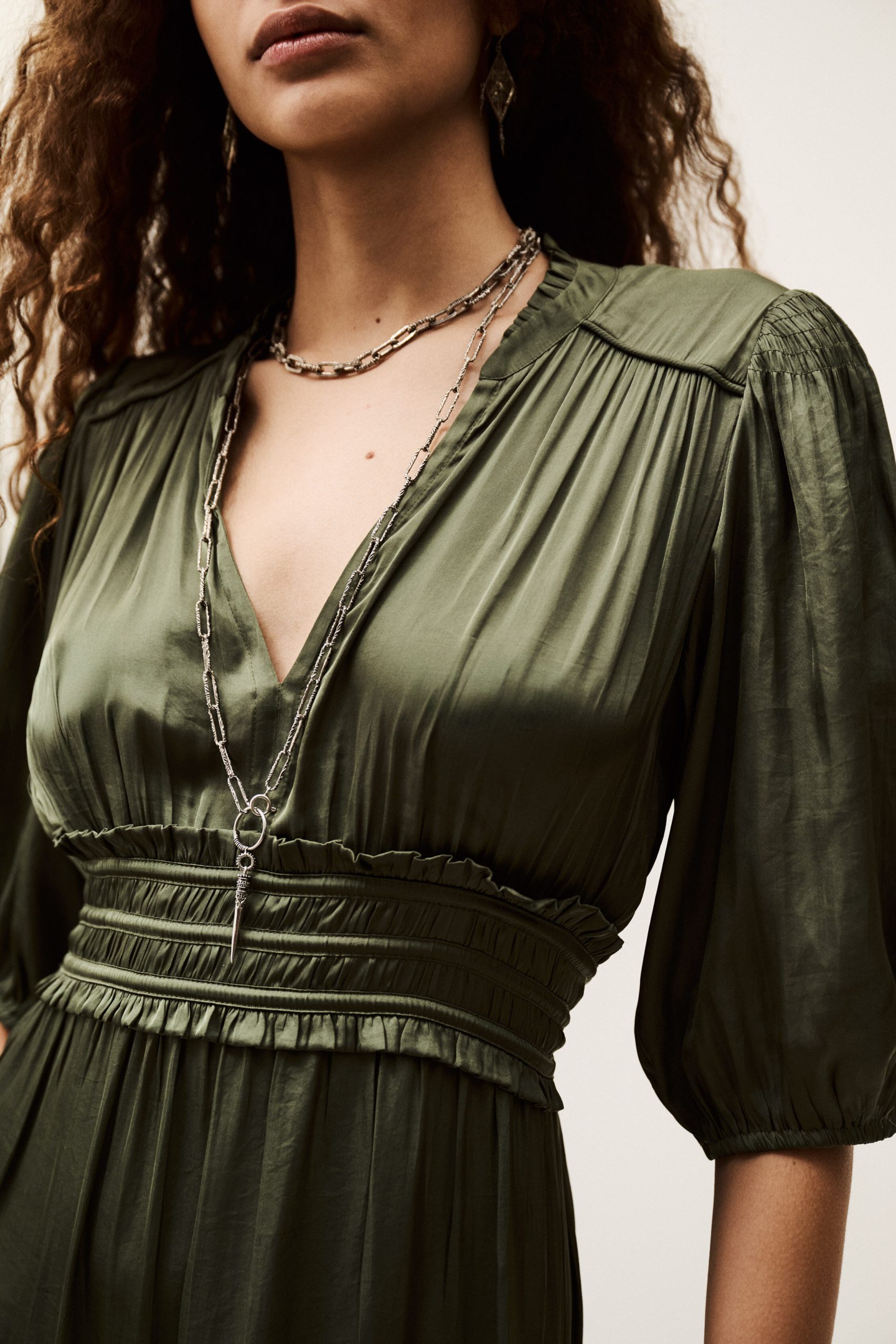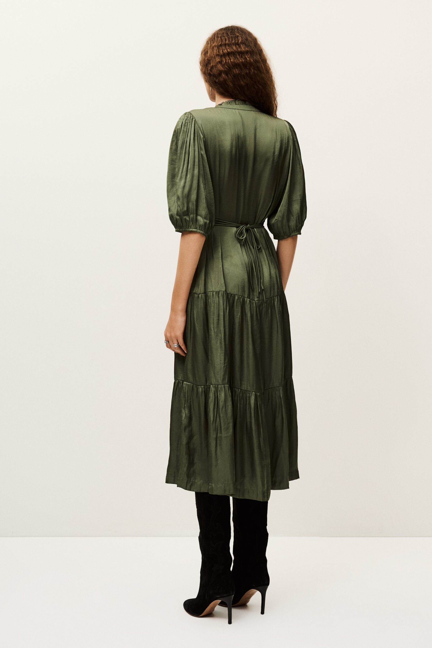 – Elasticated 3/4 sleeves- Low-cut V-neckline- Small collar frill- Waist strings and frills- Tie-up back- Frilly skirt detail- Worn loose or slim-fittingThis model contains recycled synthetic fibers.
