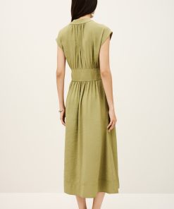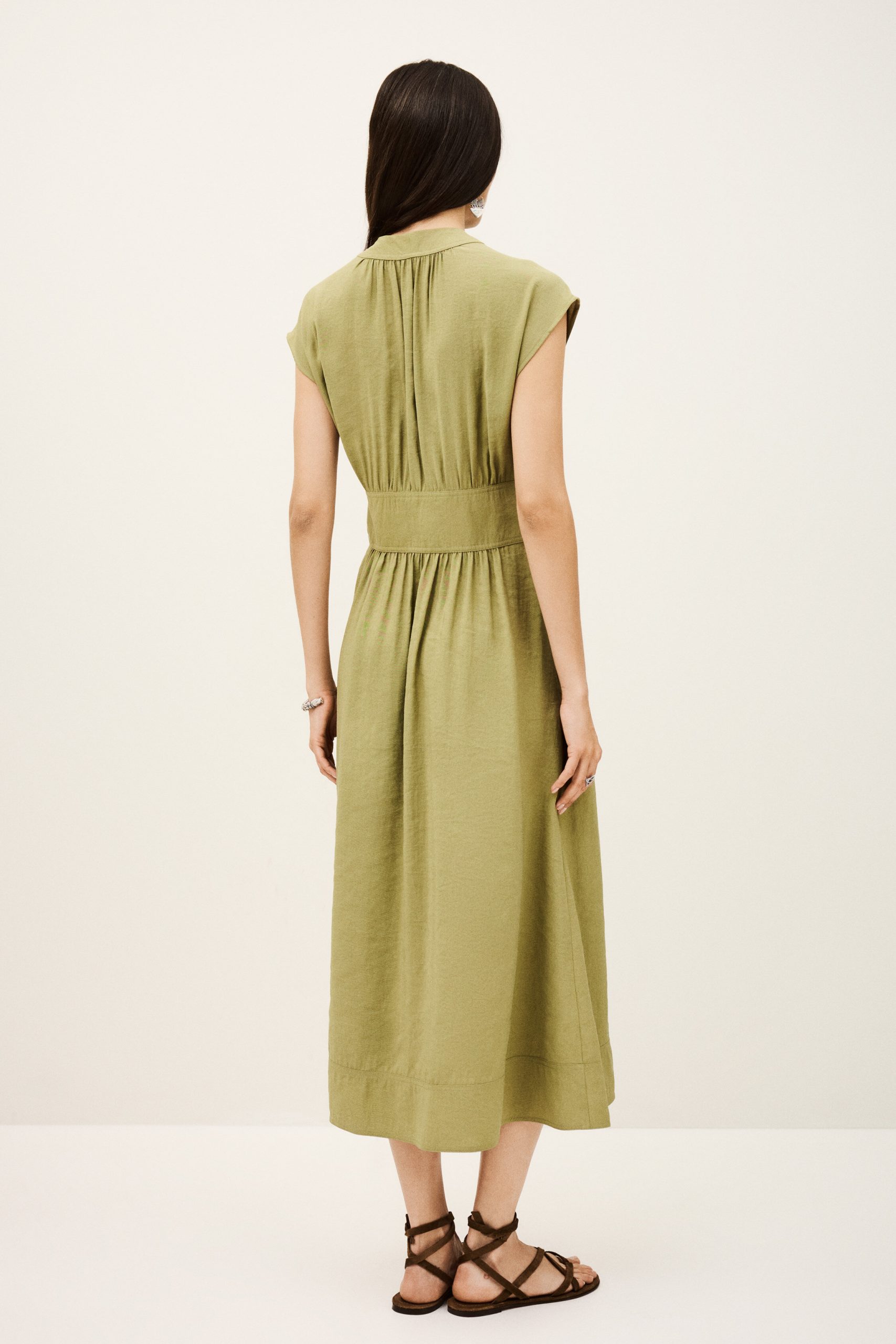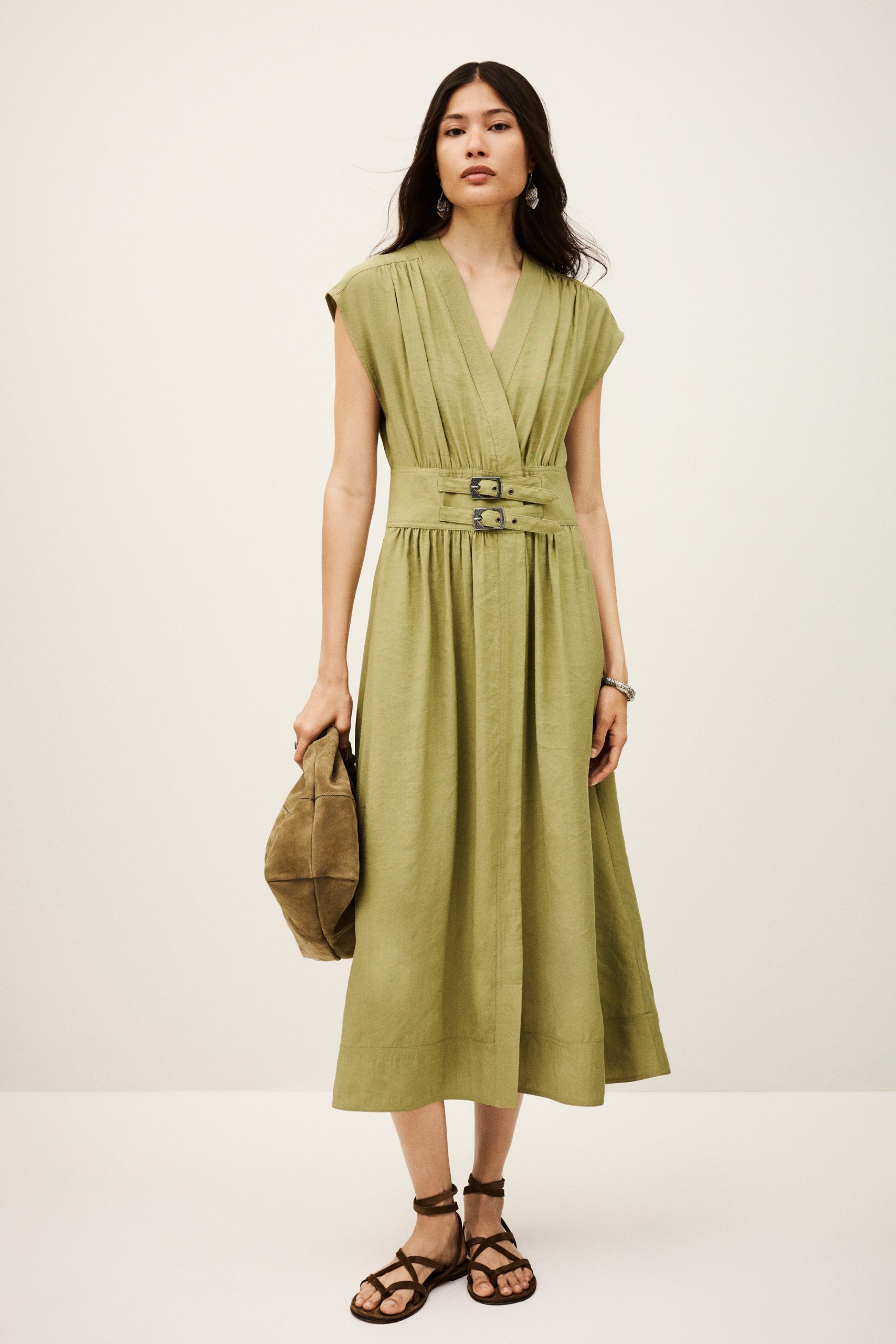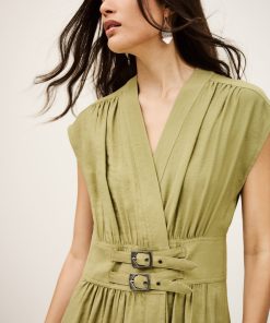 – Midi length- Wrap style- Short sleeves- Pleated style shoulders- Large belt with two metal bucklesThis model contains recycled synthetic fibers.