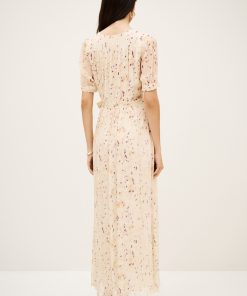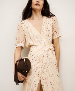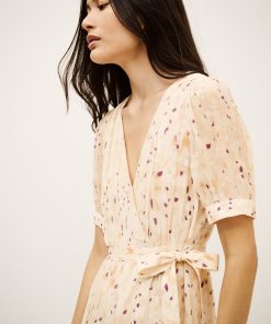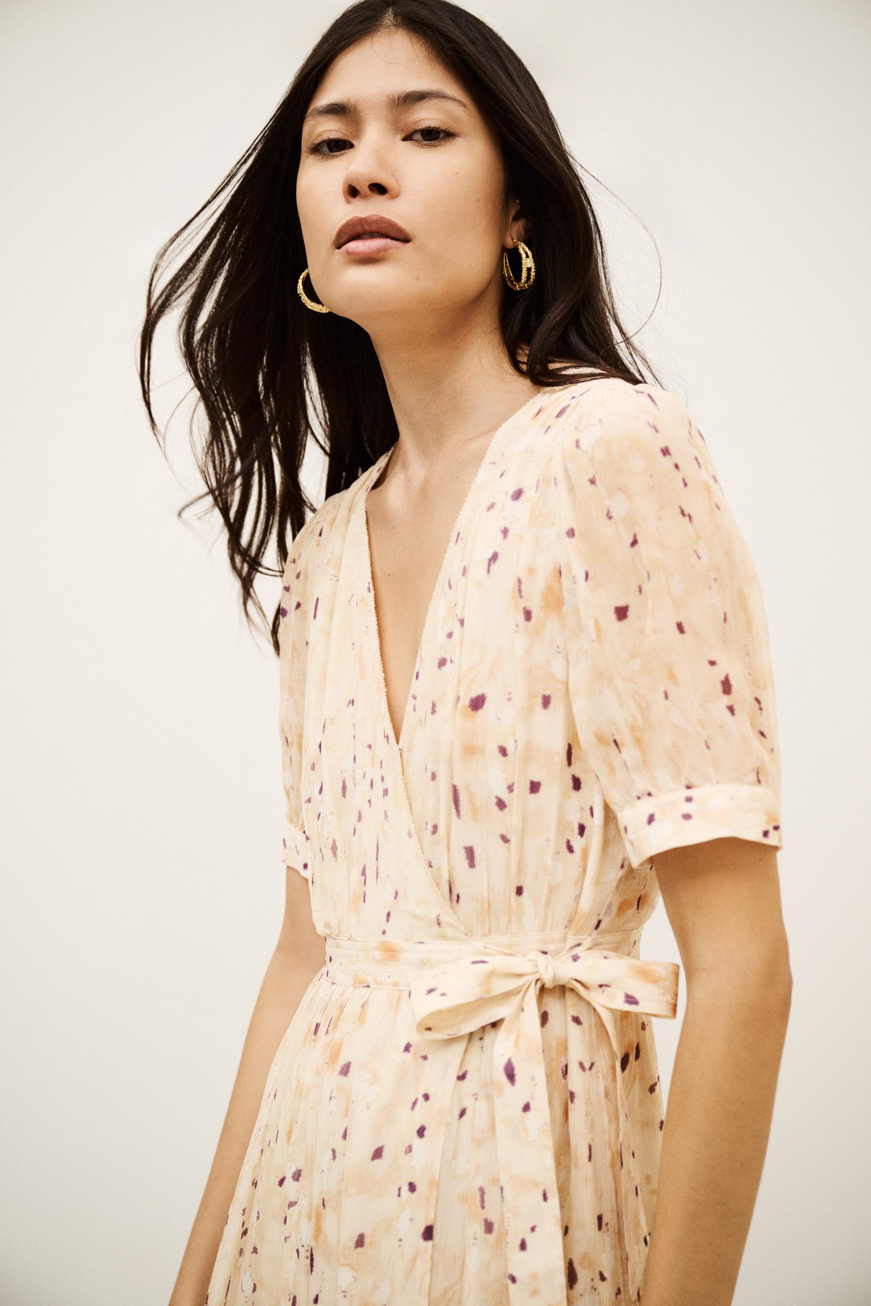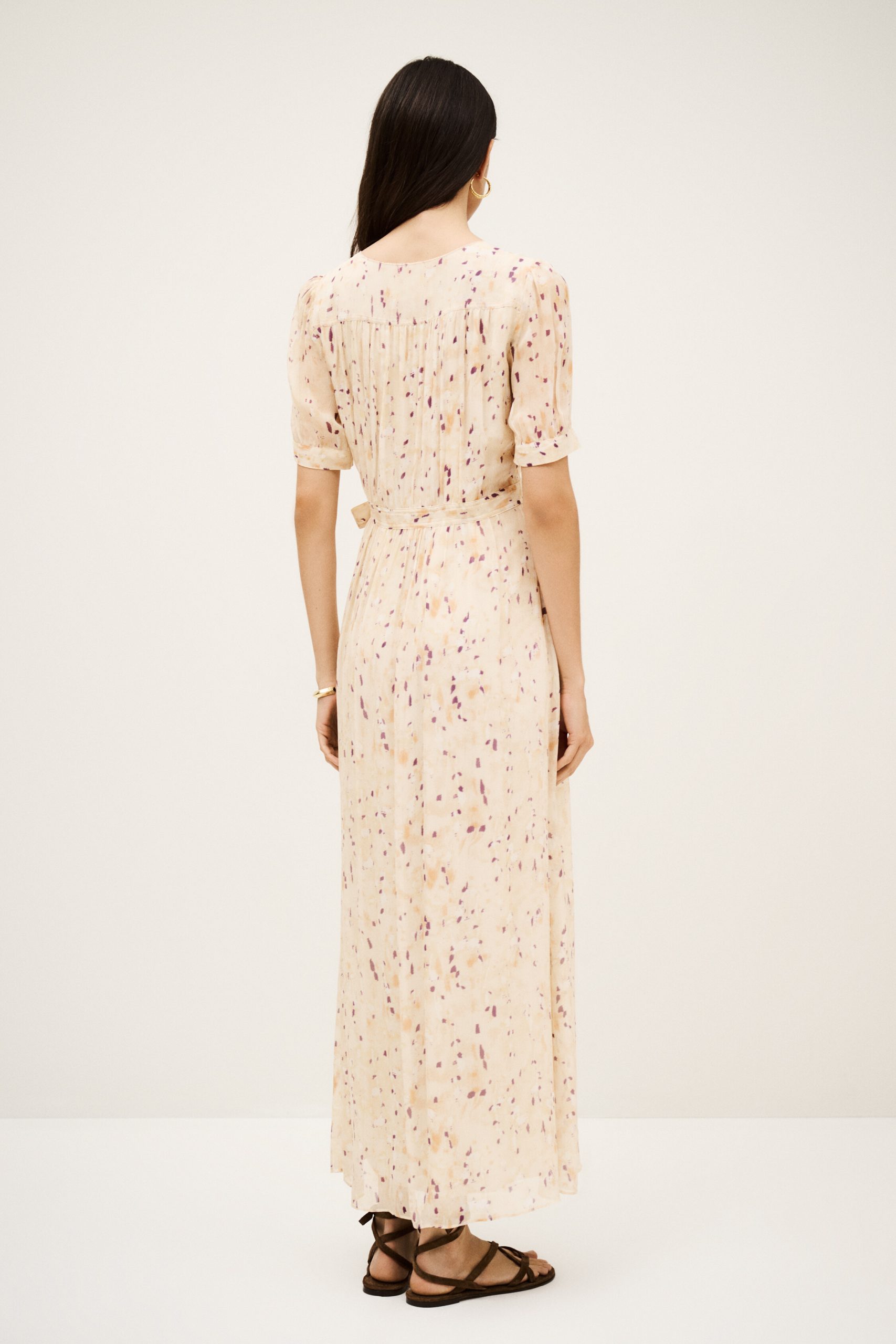– Maxi length- Wrap style- Short sleeves- Gathered look- Tie belt- Lined garment (except sleeves)- Printed patternThe viscose in this model is made from wood pulp from sustainably managed forests.