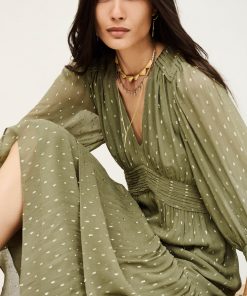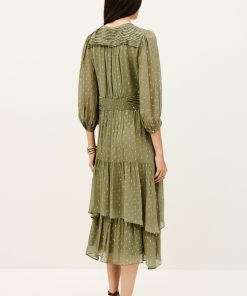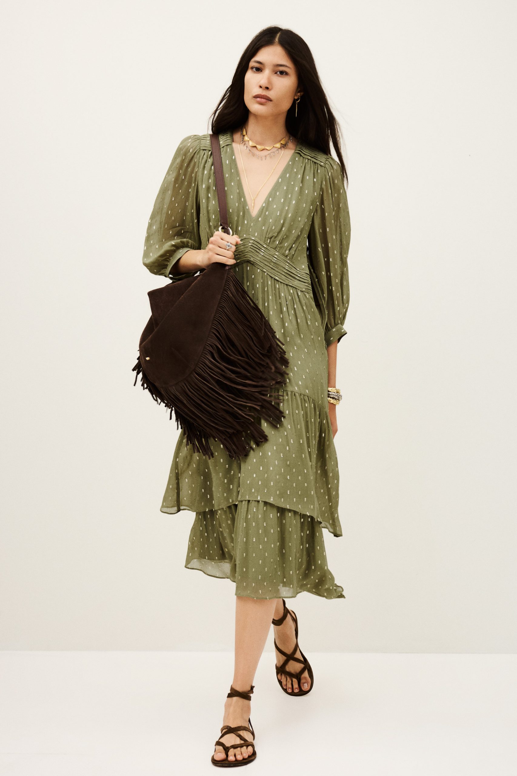 – Midi length- Flowing- 3/4 puff sleeves- V-neckline- Fitted gathered waist- Asymmetrical tiered base- Lined garment (except sleeves)The viscose in this model is made from wood pulp from sustainably managed forests.