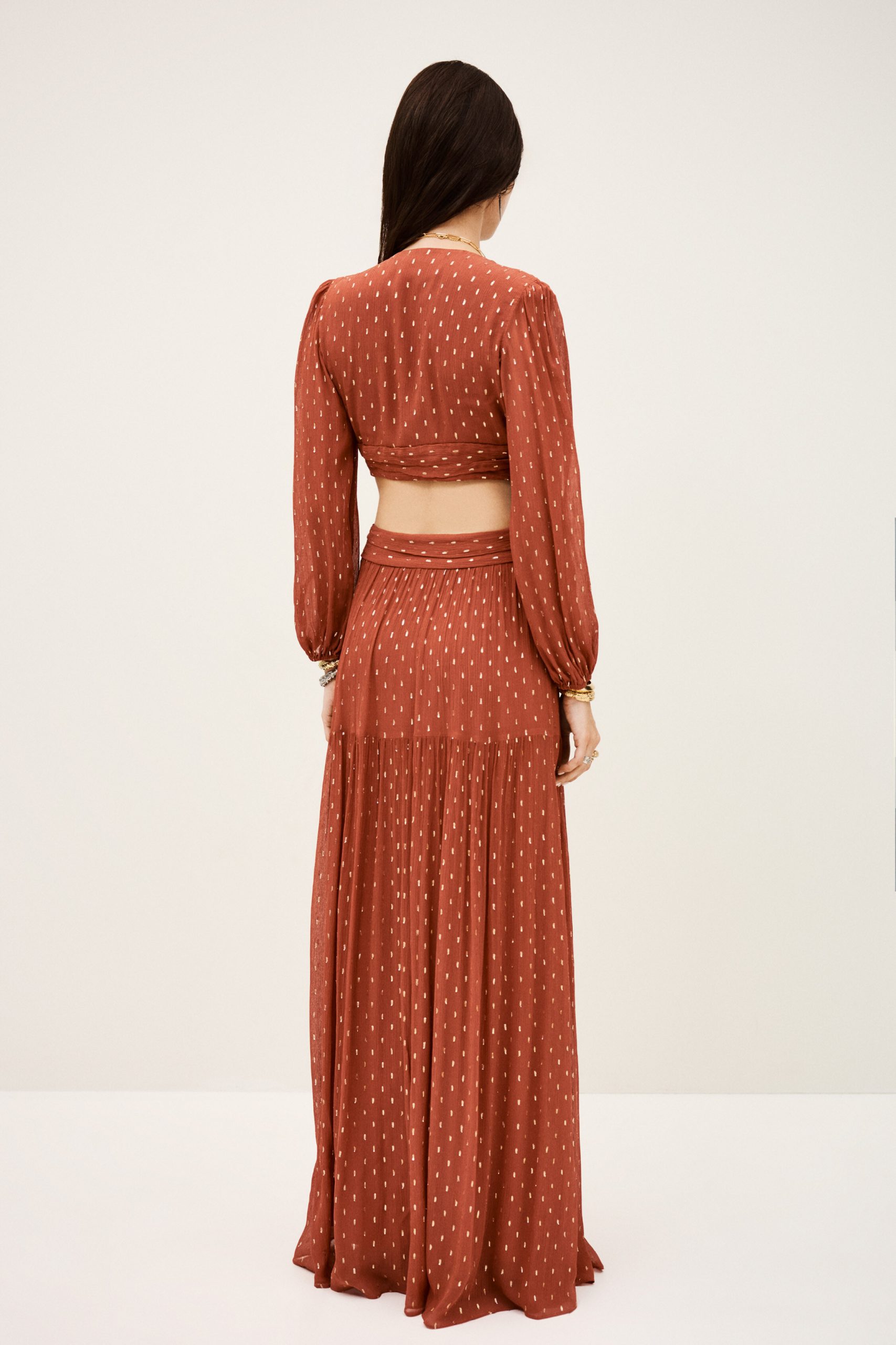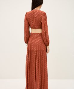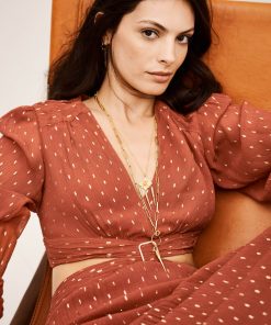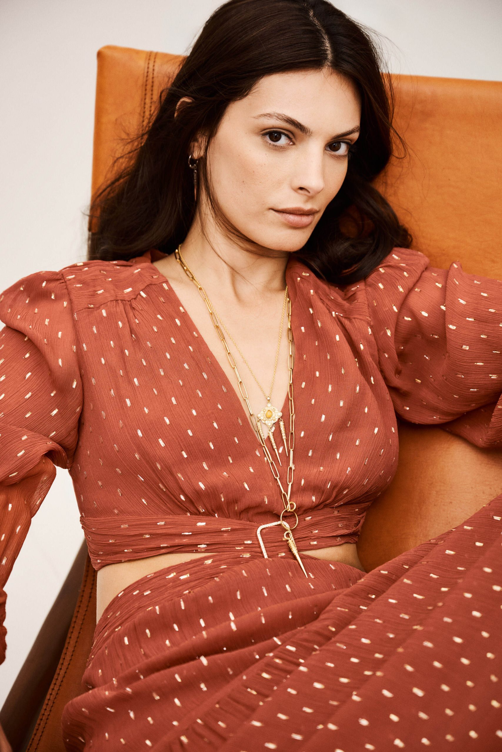 – Flowing- 3/4 sleeves- Elasticated cuffs- V-neckline- Graphic style waist seams- Pleats and drapes- Openwork back- Lining- Lurex detailsThe viscose in this model is made from wood pulp from sustainably managed forests.
