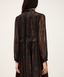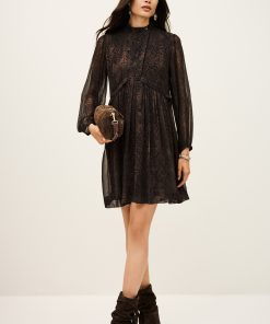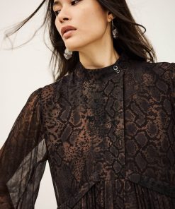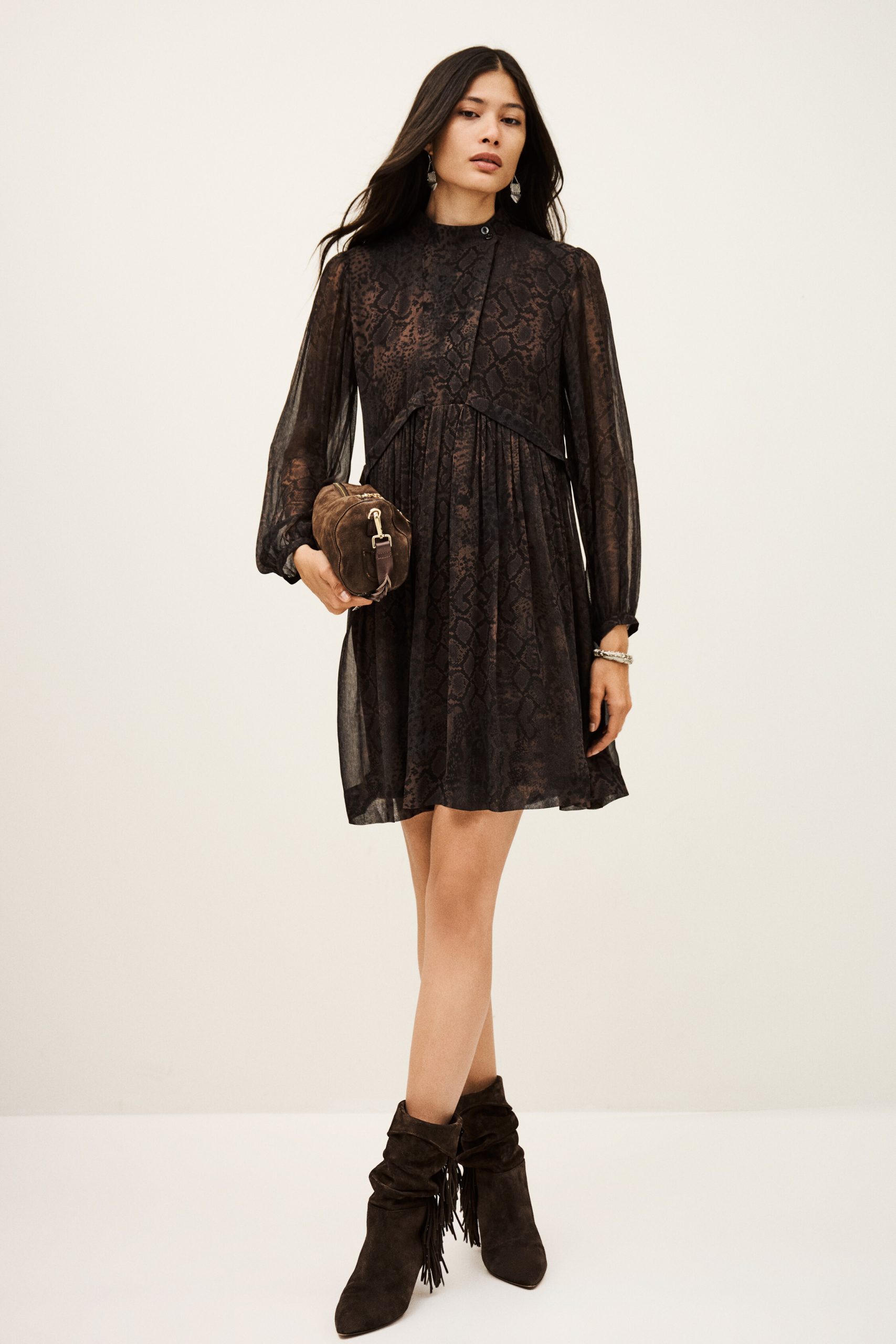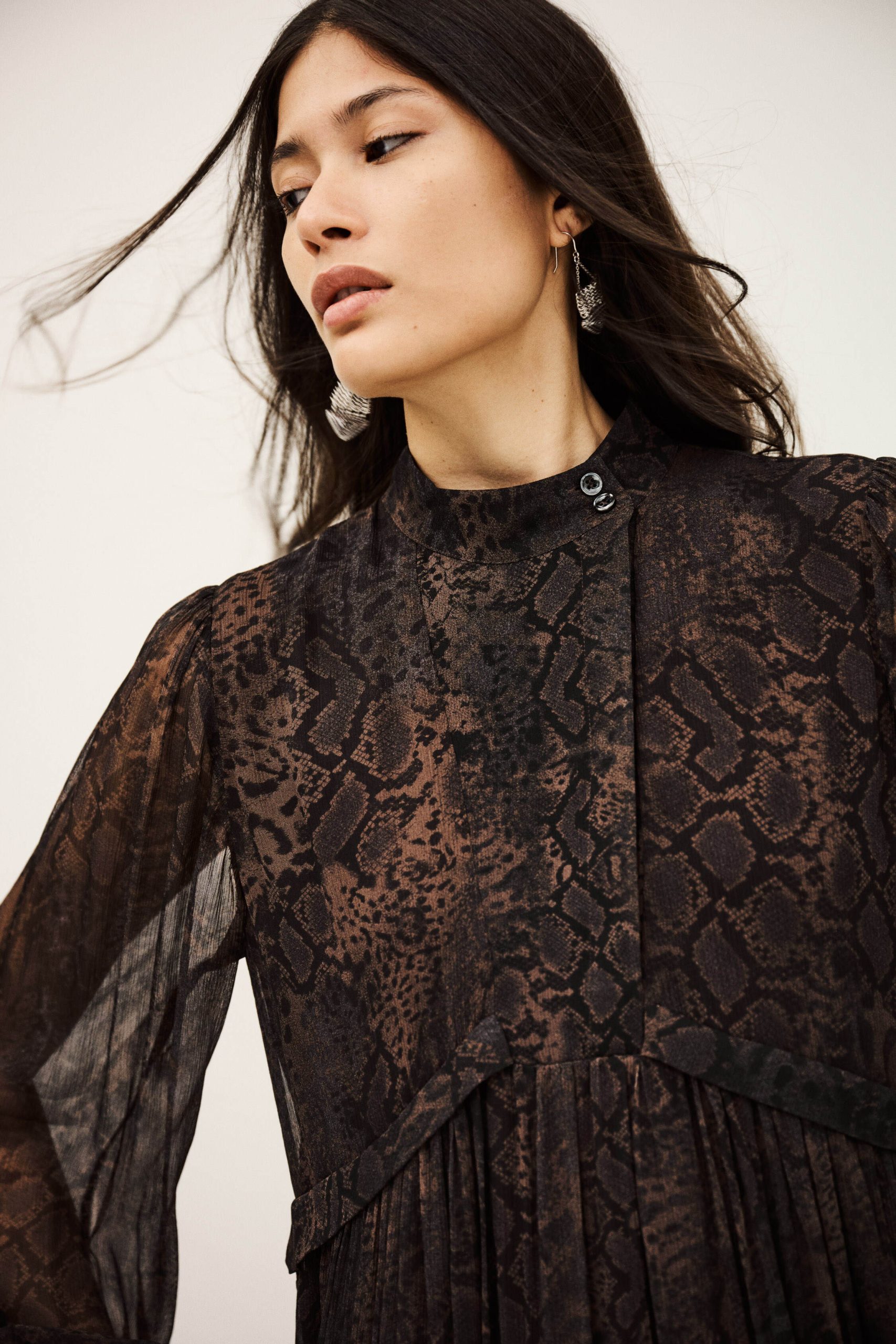 – Loose fit- Iconic ba&sh print- Stand-up collar with offset button- Front bib (plastron)- Long loose sleeves- Pleated seams under the chest- Gathers emanating from the pleatThe viscose in this model is made from wood pulp from sustainably managed forests.