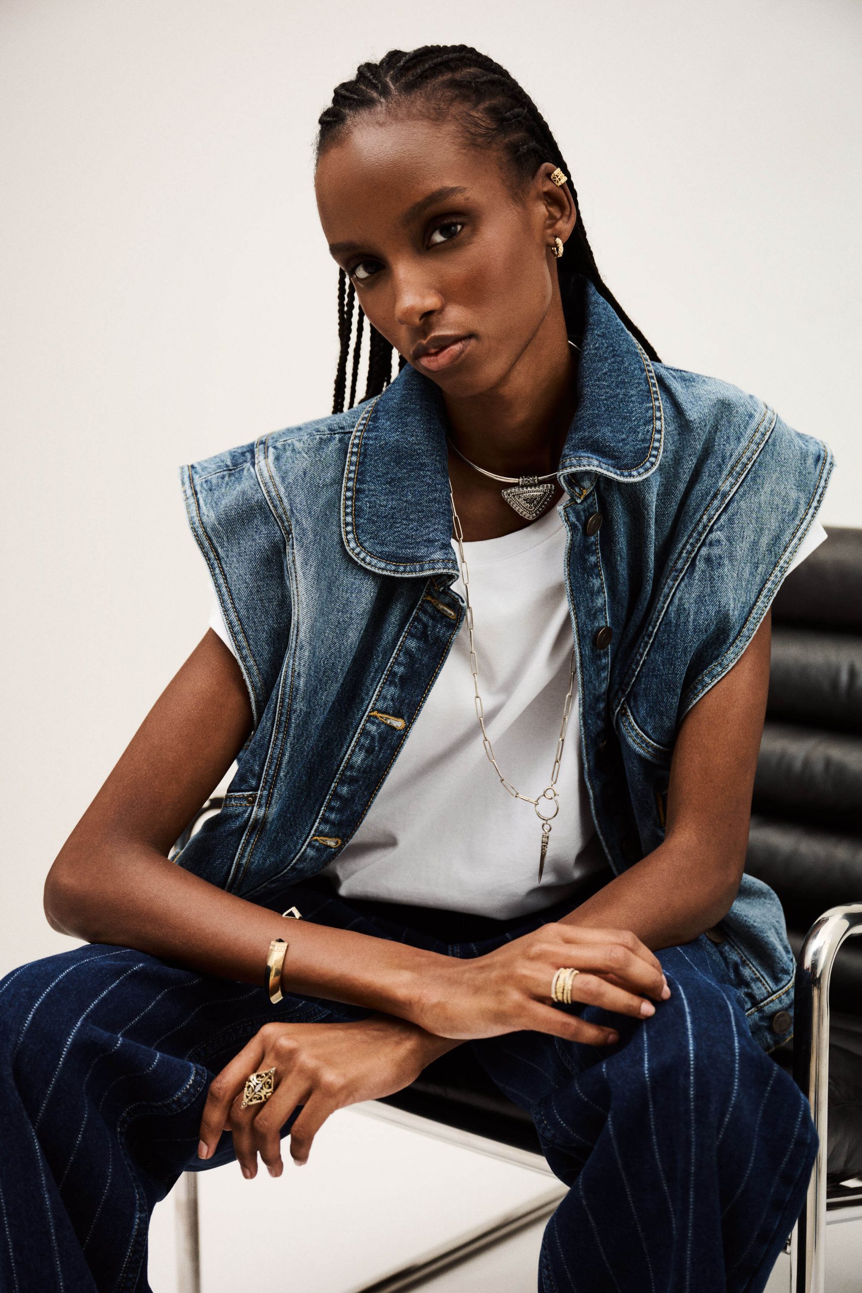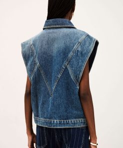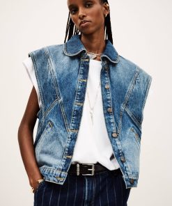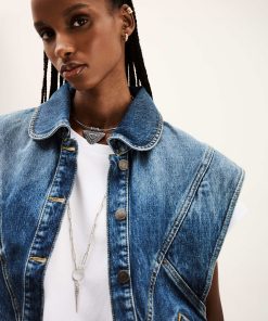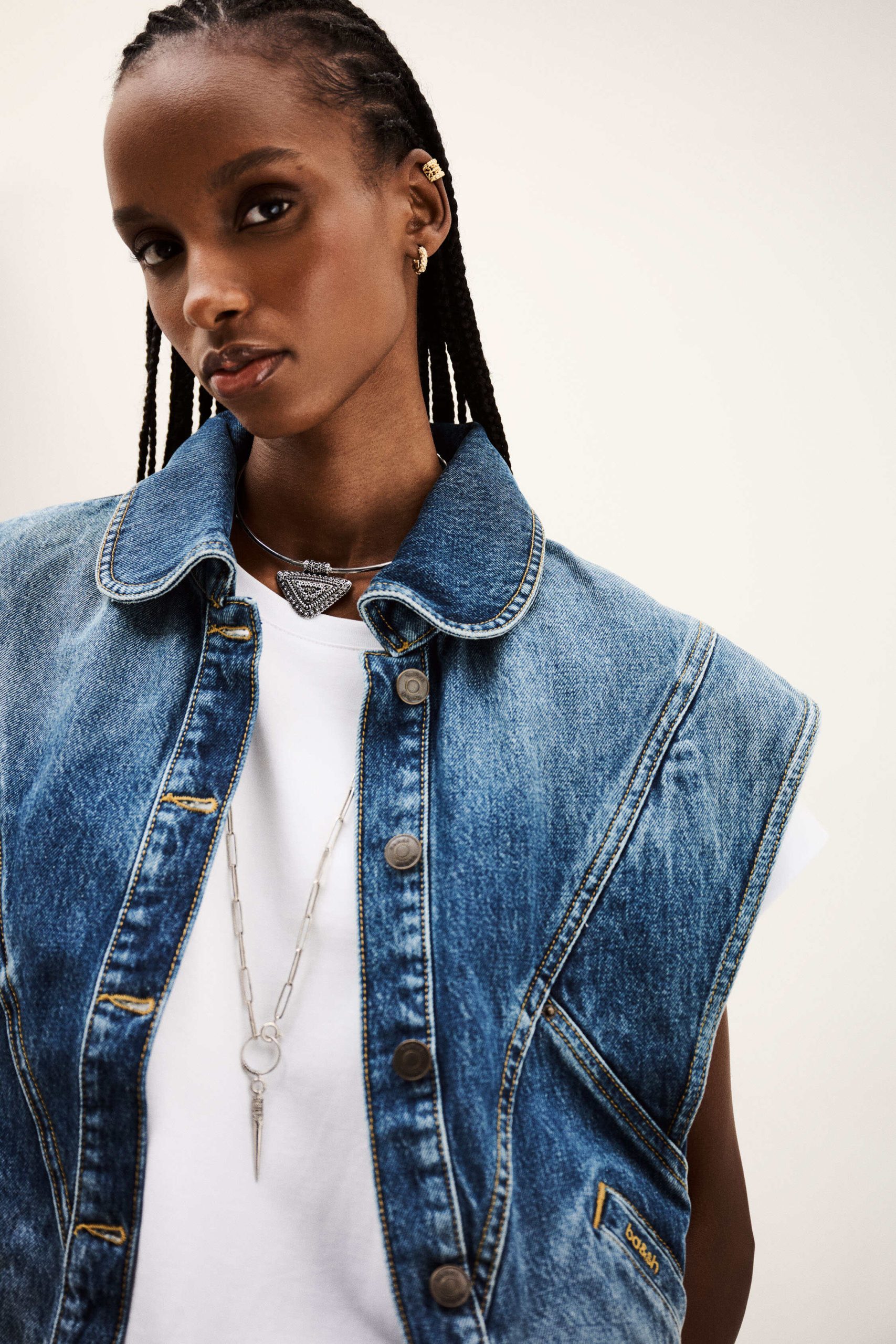 “Inspired by 1980s styles, our sleeveless MAX jacket is a must-have for your collection. This denim jacket is made cropped with a buttoned front. We love its striking topstitches and side pockets. Perfect all year round, this jacket will quickly become a staple. Pair it with a T-shirt or top and shorts or a skirt. You can also wear it with a country style plaid shirt. Feel free to mix up your styles!