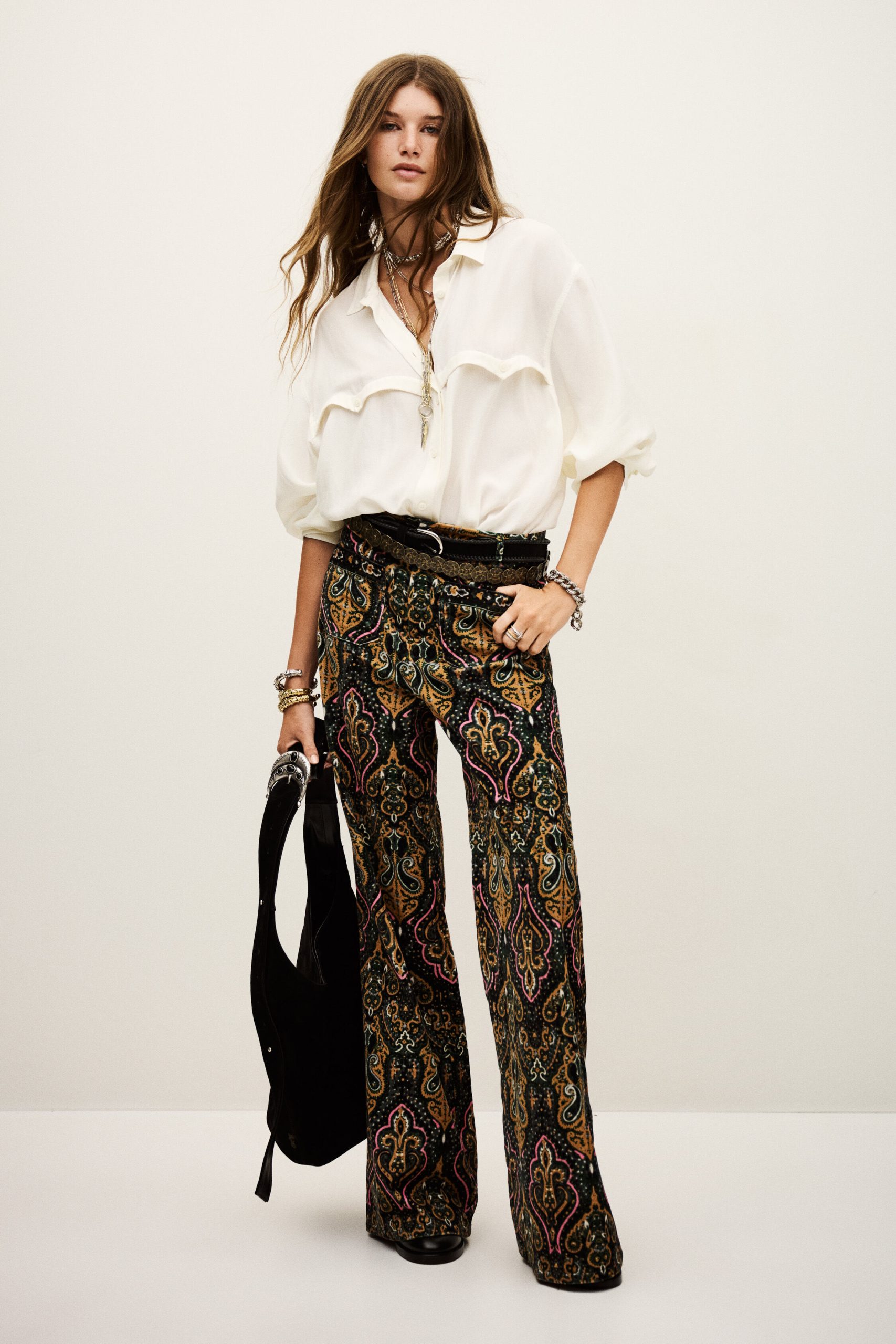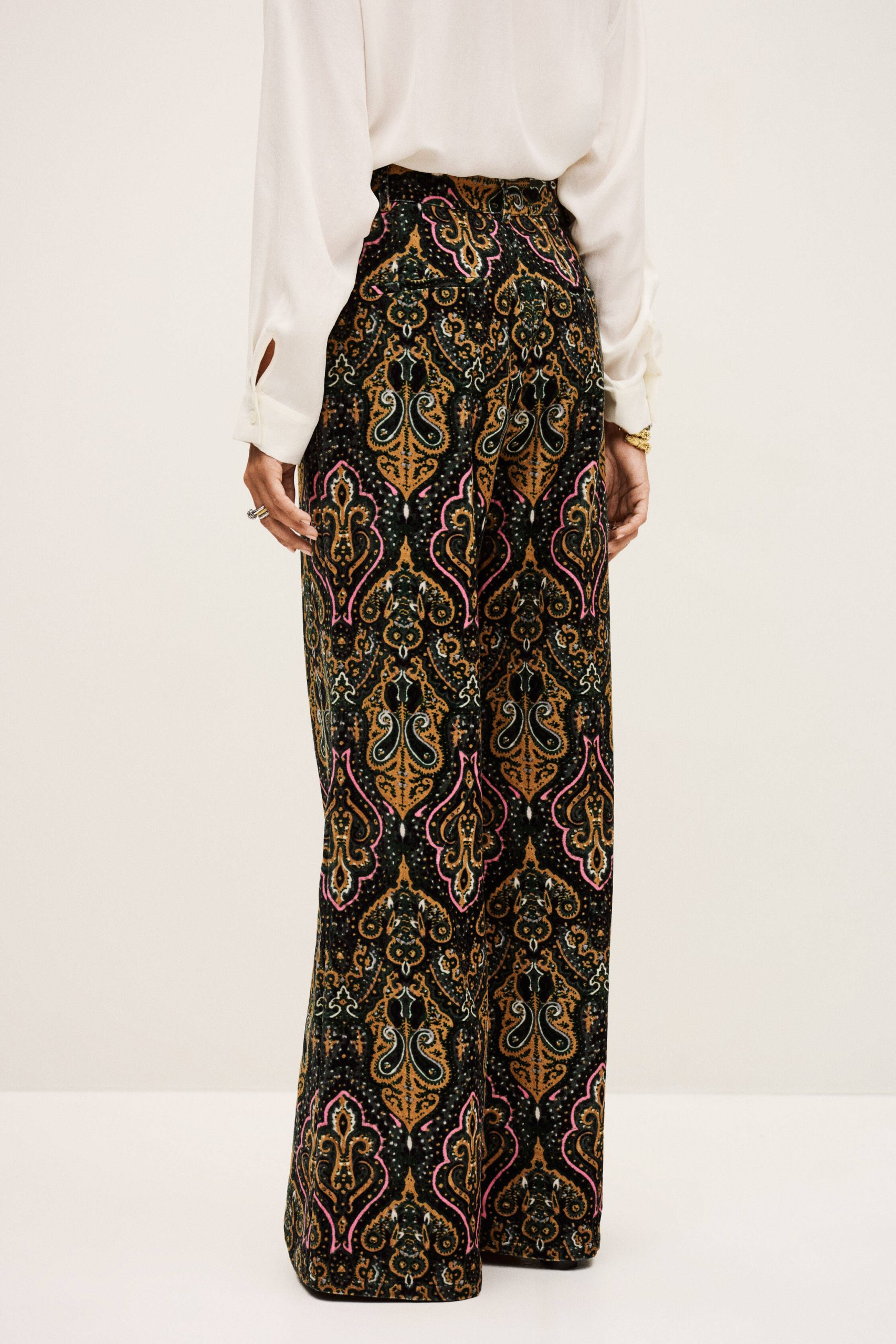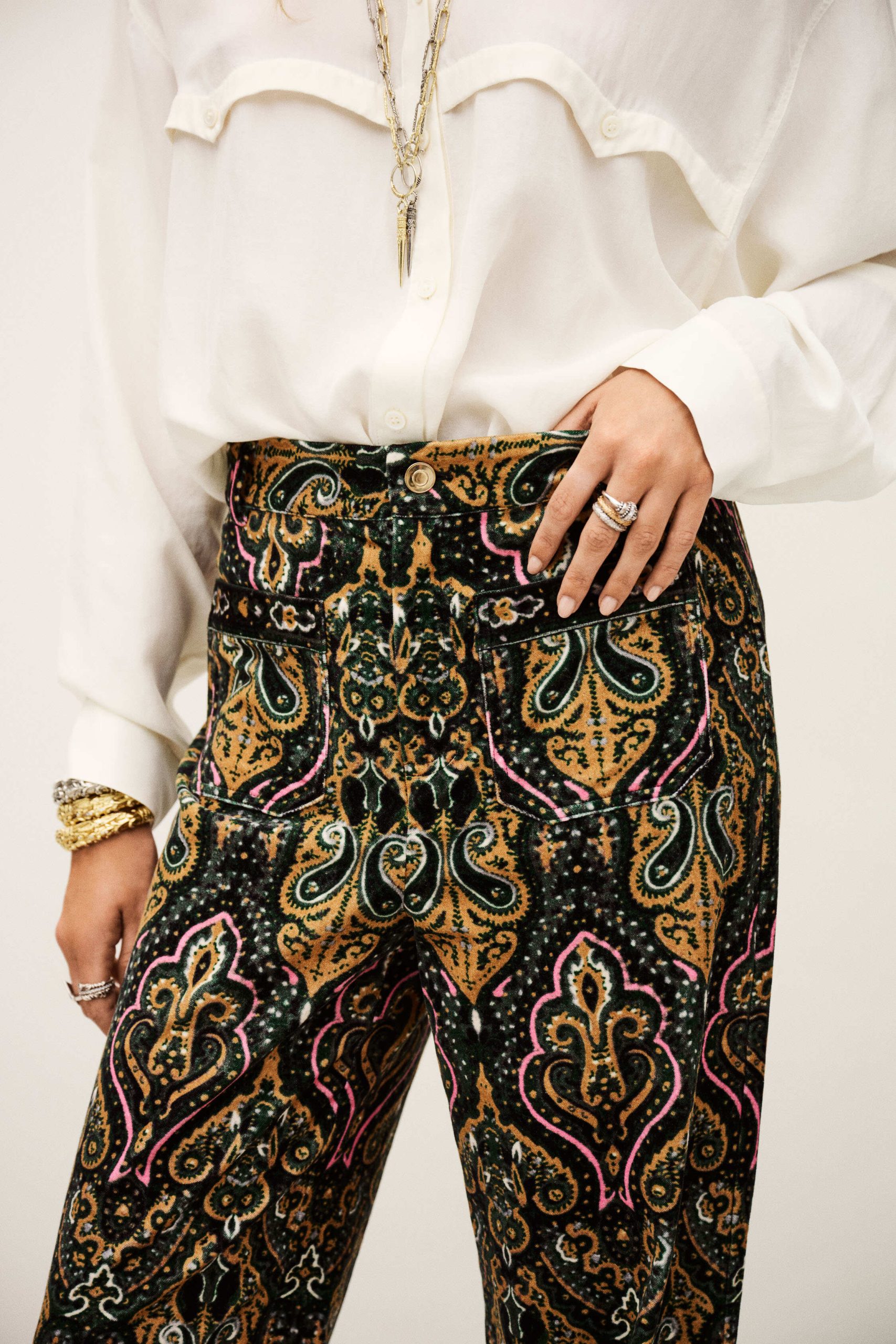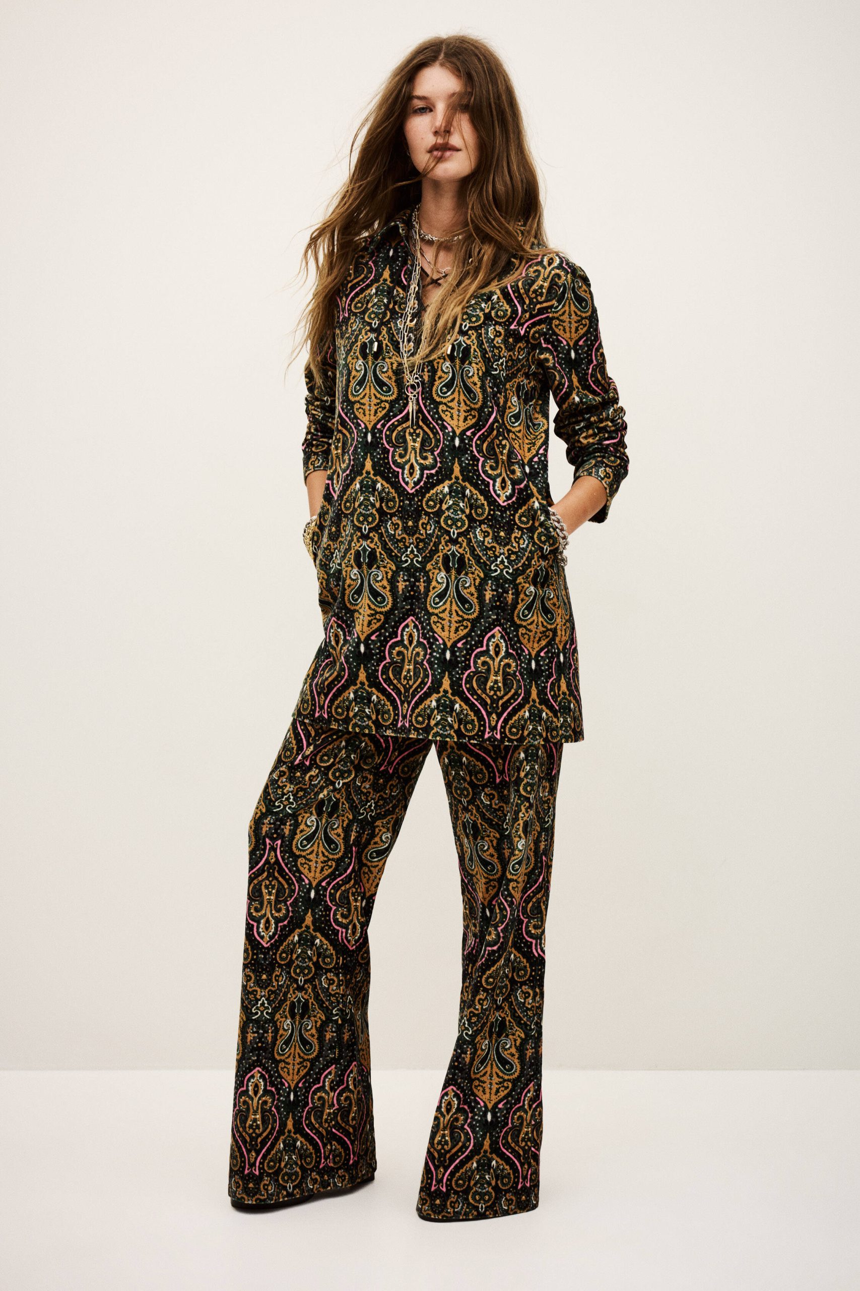 – Flare cut- Patterned velvet- Front patch pockets- Gold button- 70s spiritThe cotton fibers in this model come from organic farming.