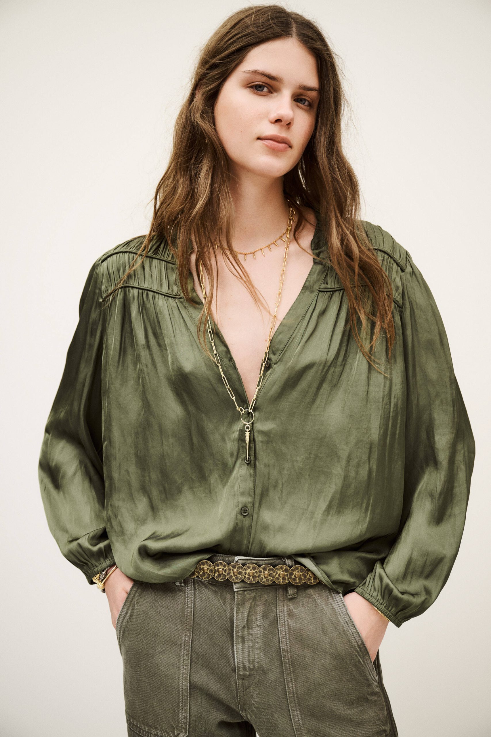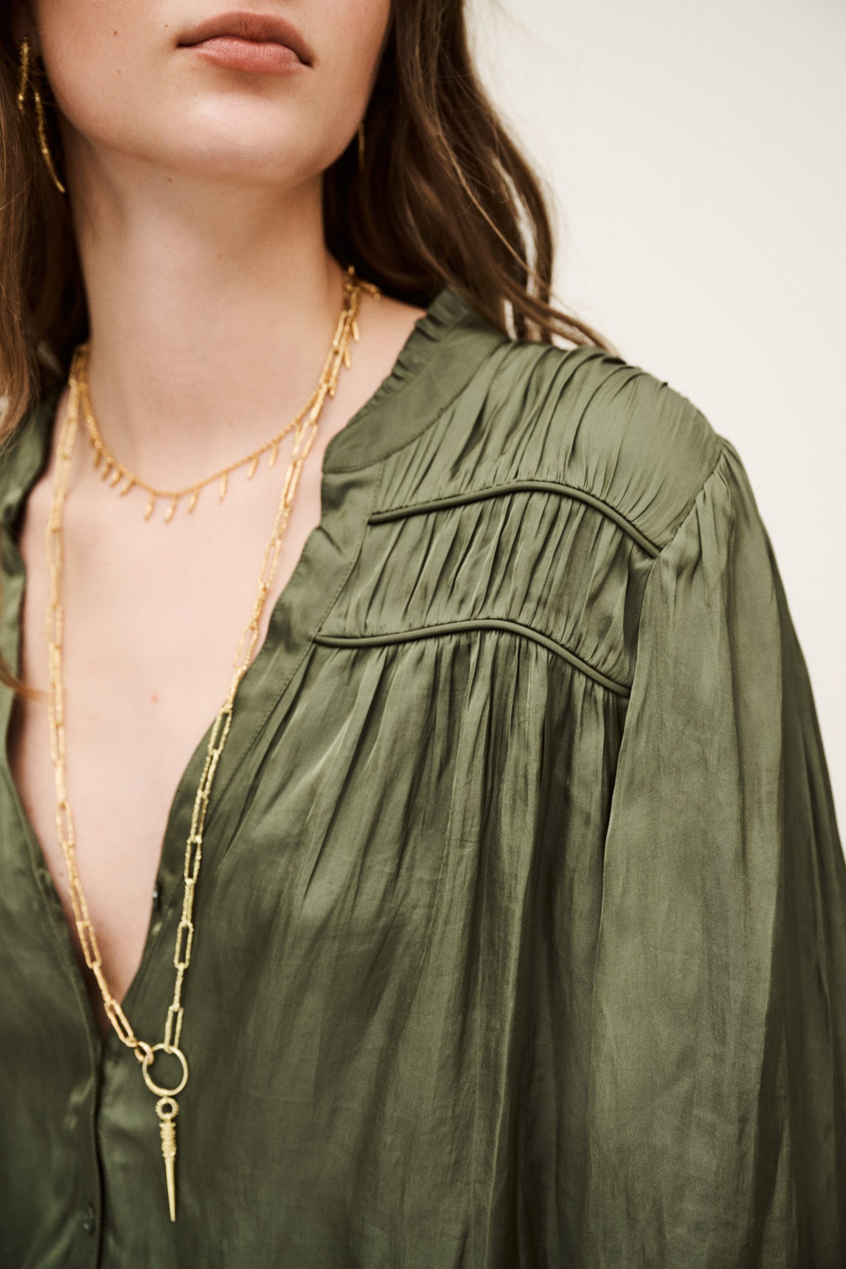 – Loose-fitting- Buttoned- V-neckline- Tapered cuffs- Frilly collar- Inlaid biasThis model contains recycled synthetic fibers.