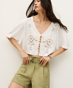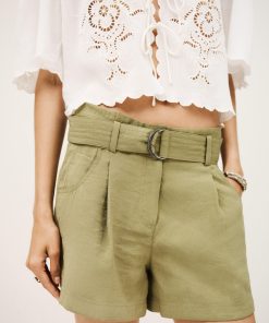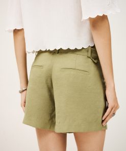 – Short flared shorts- Pleated details- Round pockets- Piped pockets on the back- Topstitched belt with metal buckleThis model contains recycled synthetic fibers.