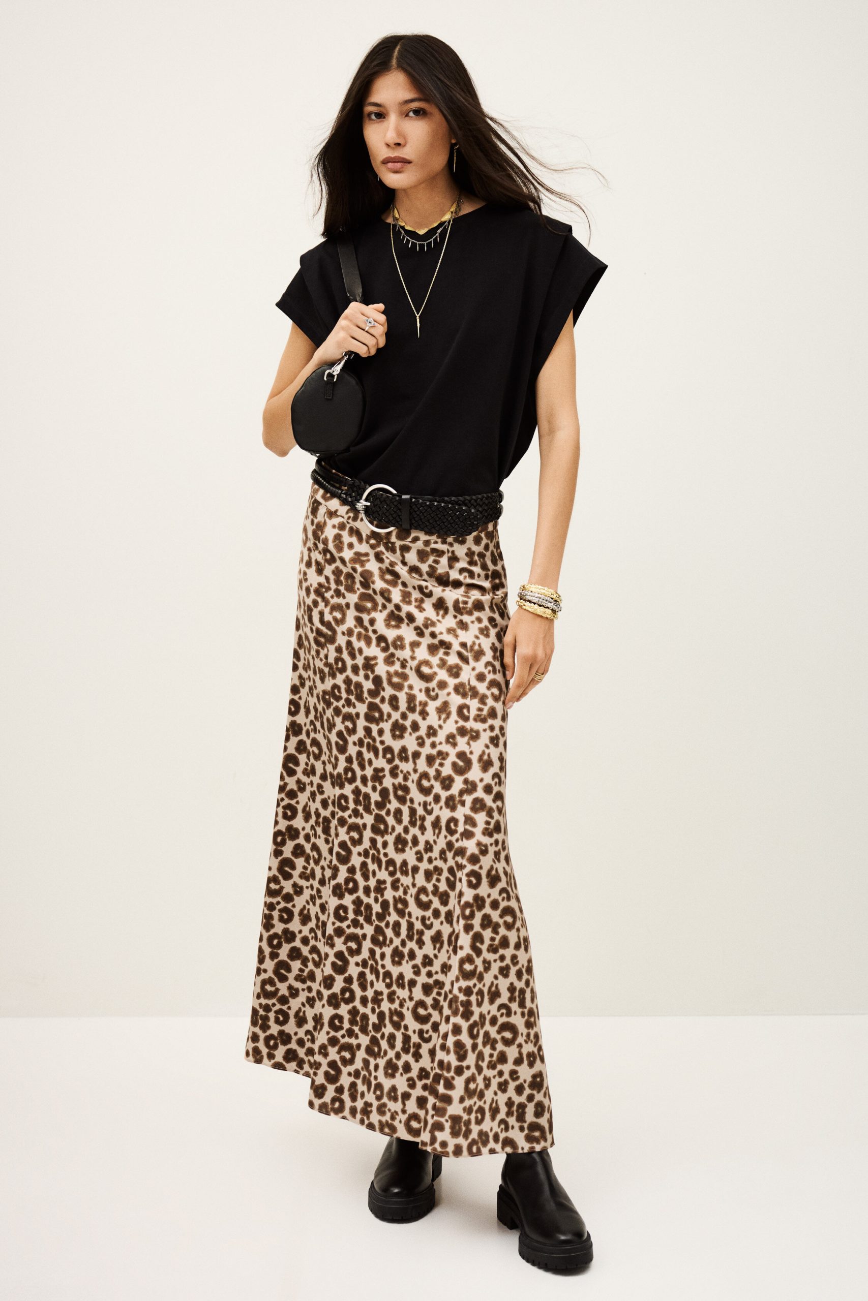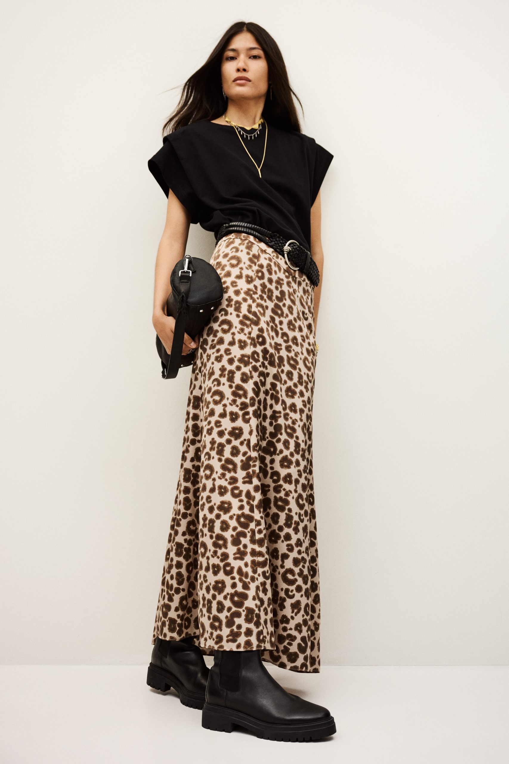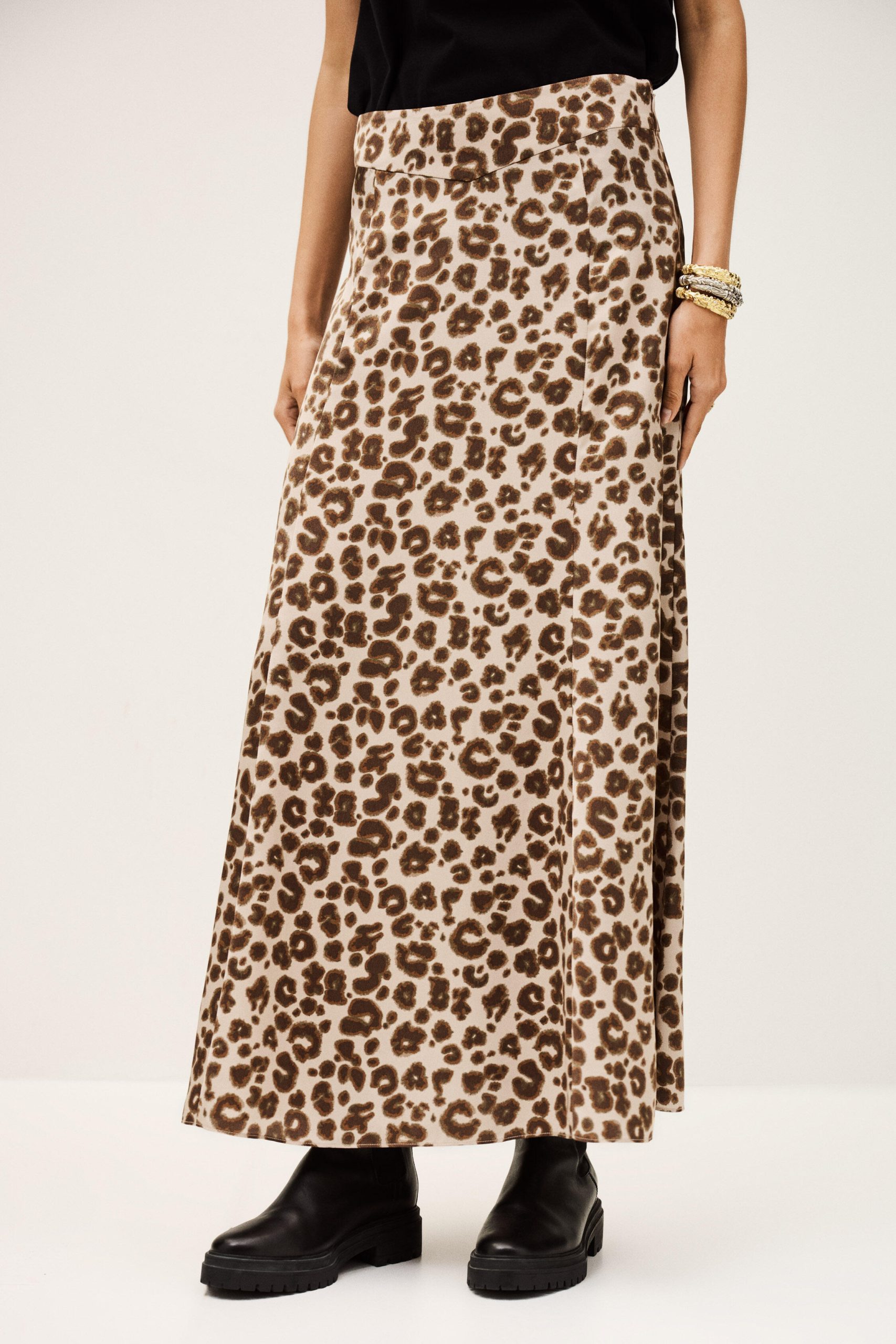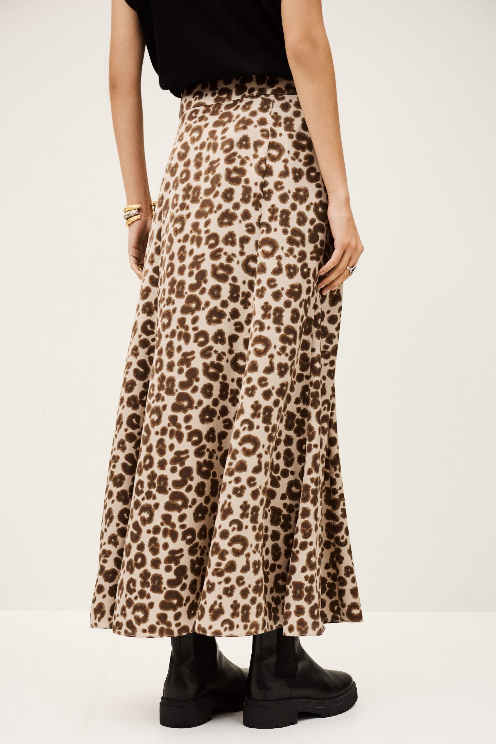 – Godet style- Leopard print- Triangular seam on the waist- Side zipper closureThis model contains recycled synthetic fibers.