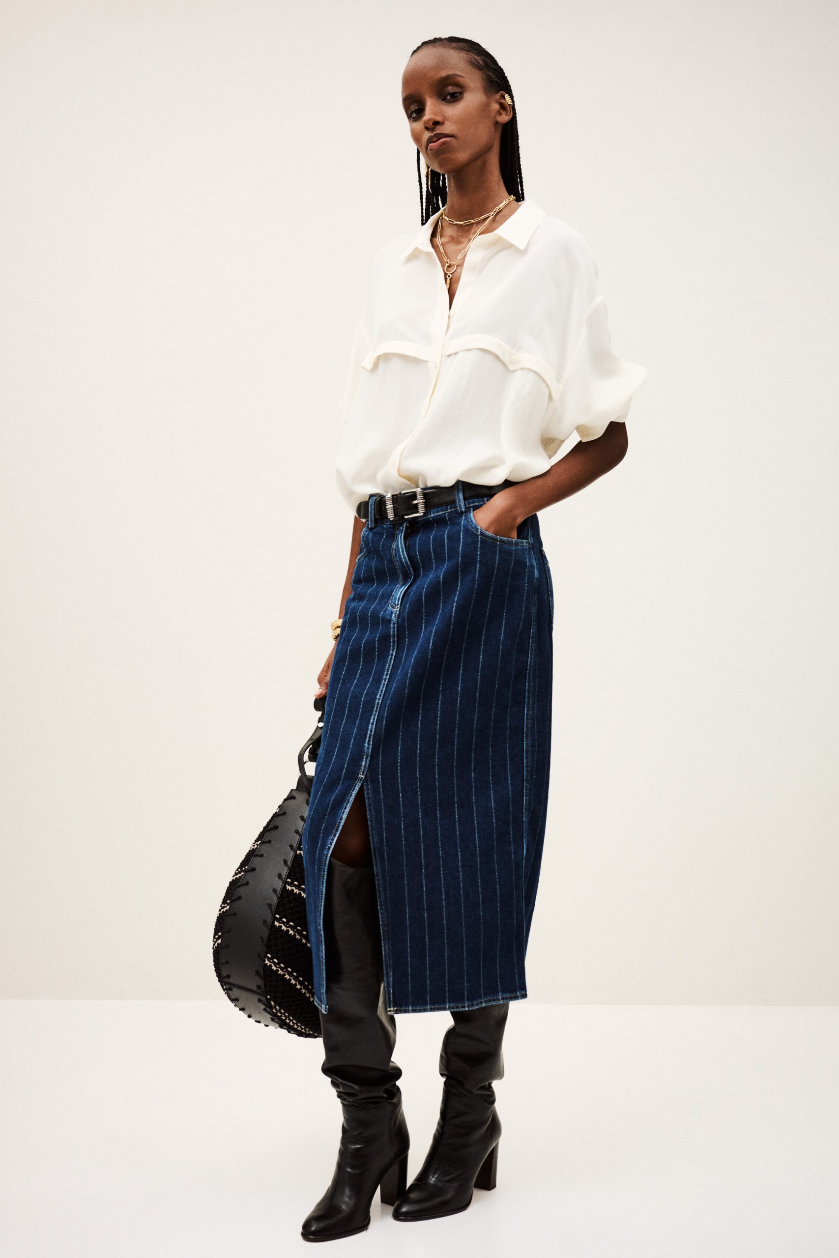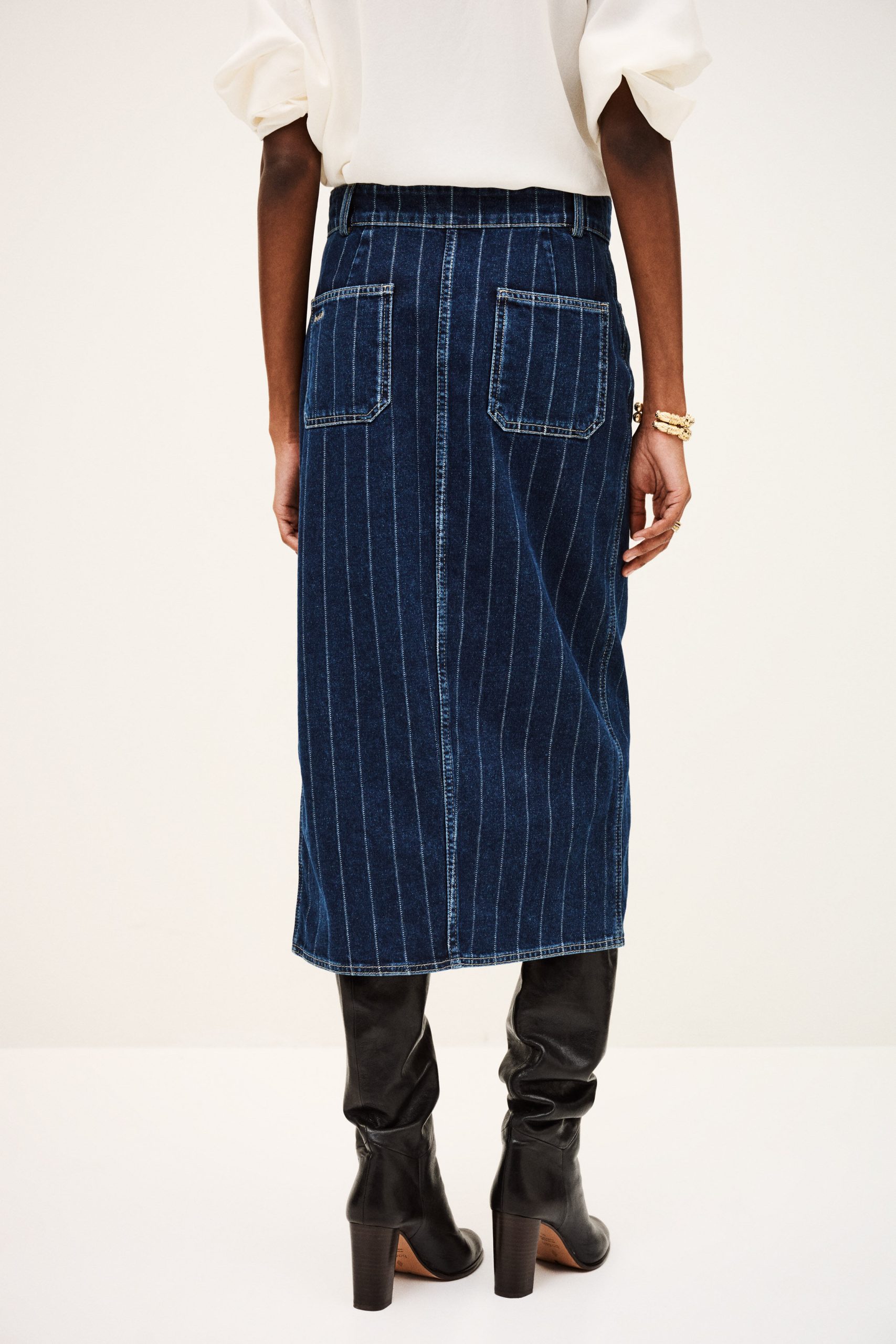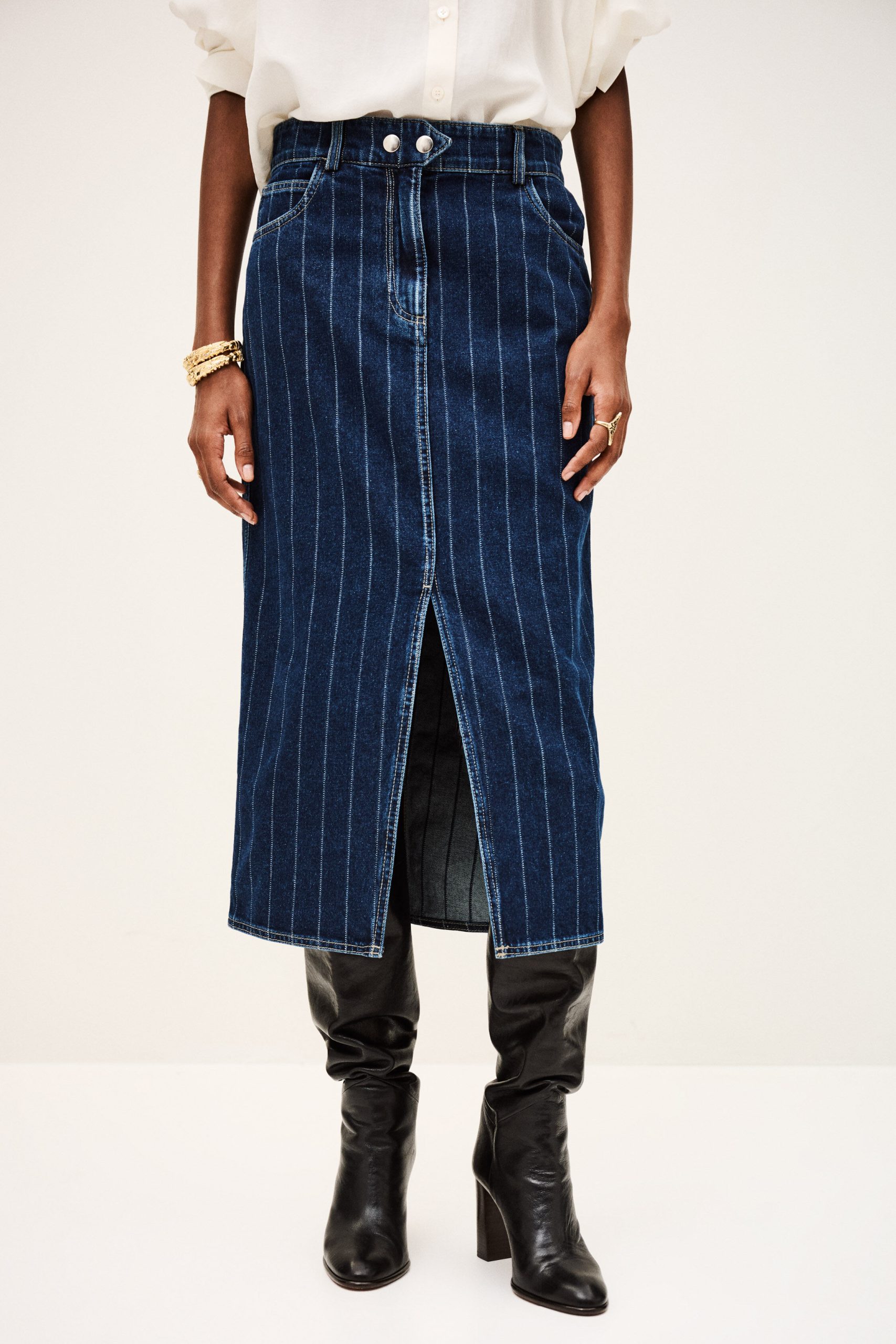 – Midi column cut- High waist- Double metal buttons at waist- Rounded front and patch back pockets- Slit for easy movement- Engraved metal hook detail at waistband- Striped denimThe cotton fibers in this model come from organic farming.