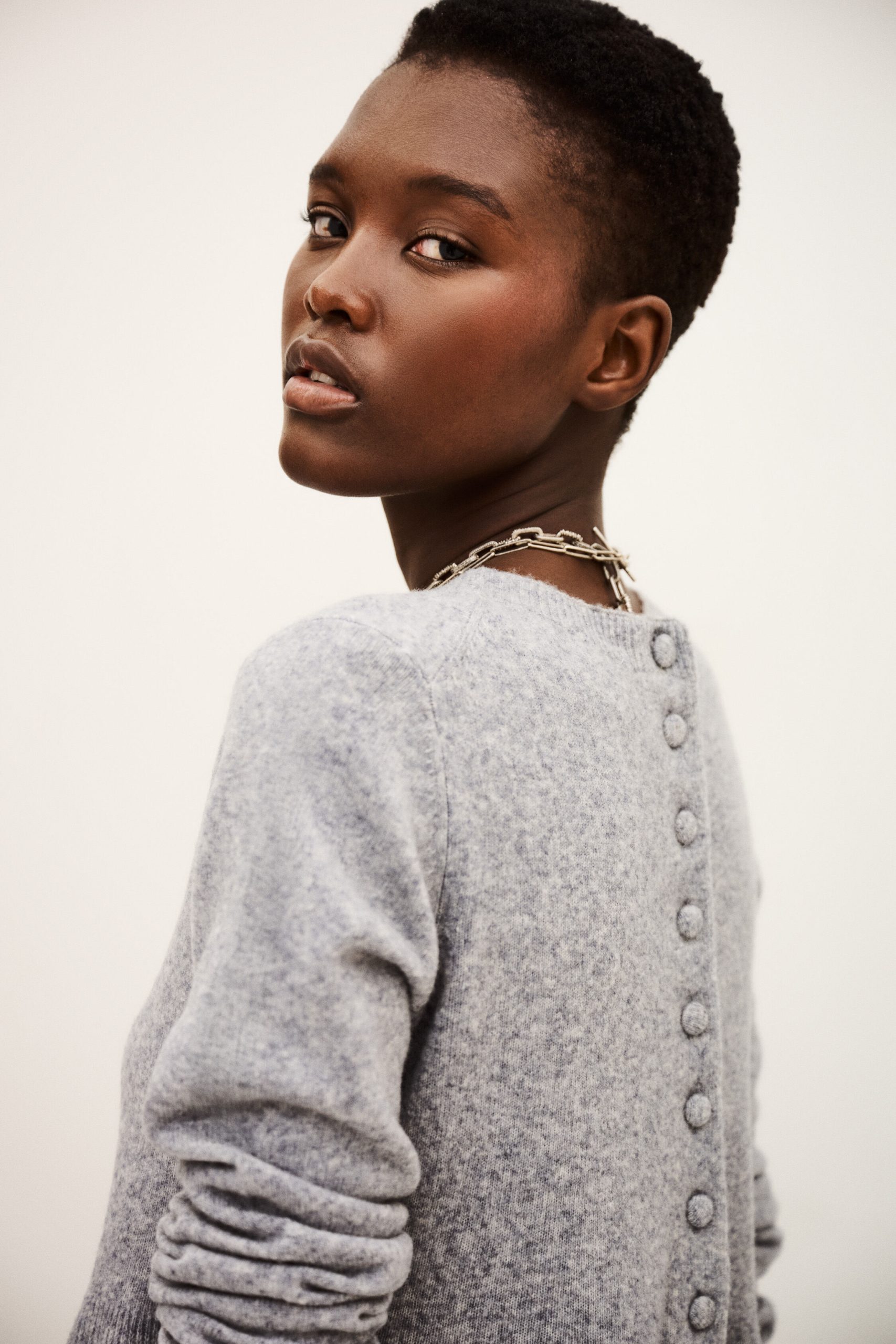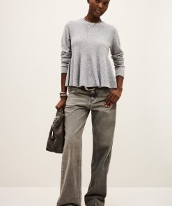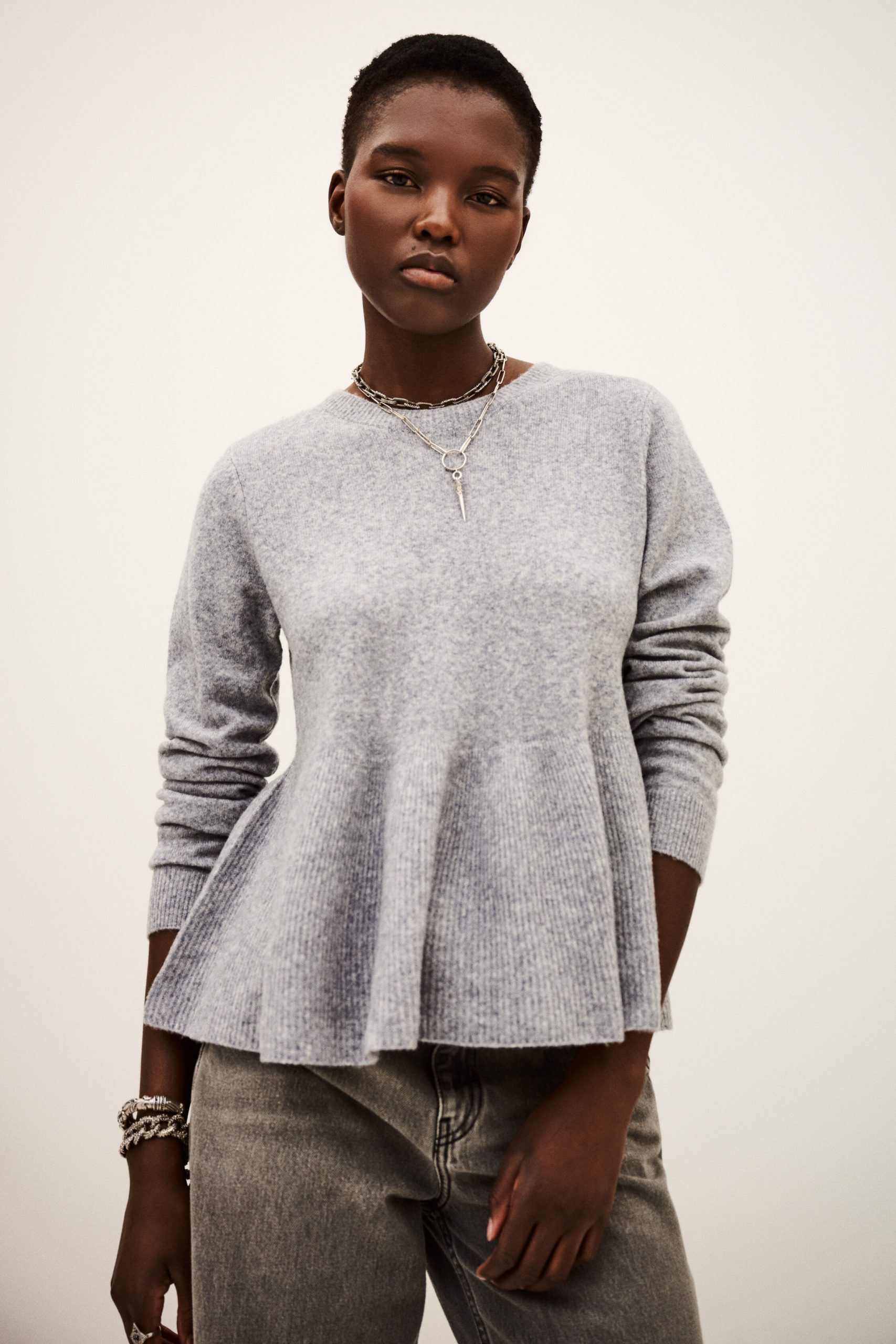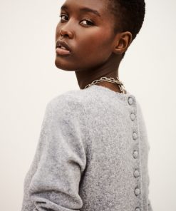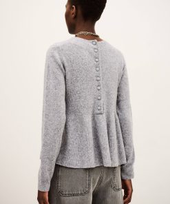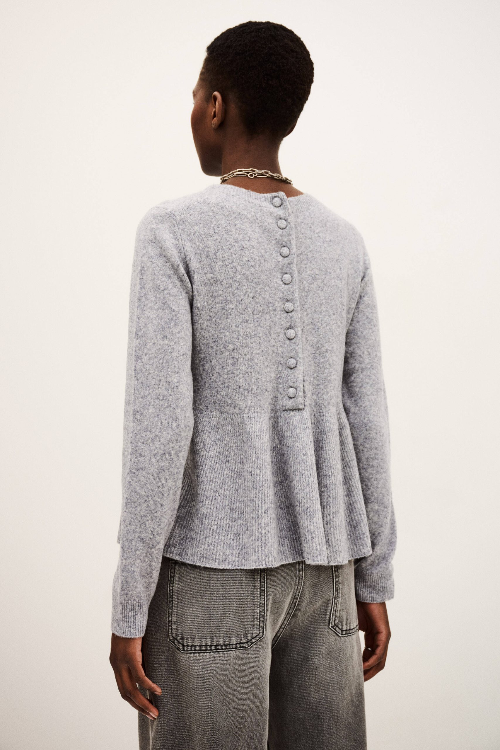 – Boxy shape with peplum cut- Round neckline- Long sleeves- Button placket on back- Stitch-covered button- Beaded jersey knitThe wool in this model comes from a certified supply chain that ensures animal welfare and sustainable pasture management.