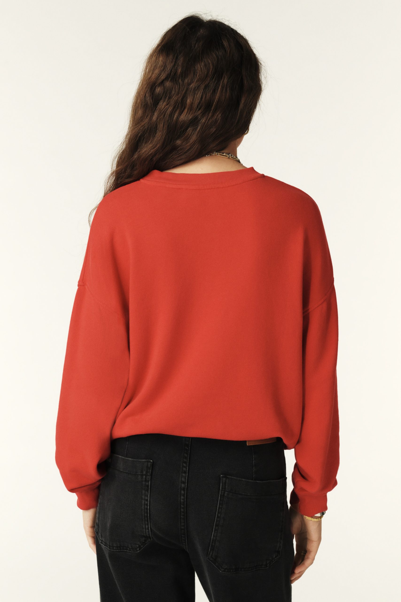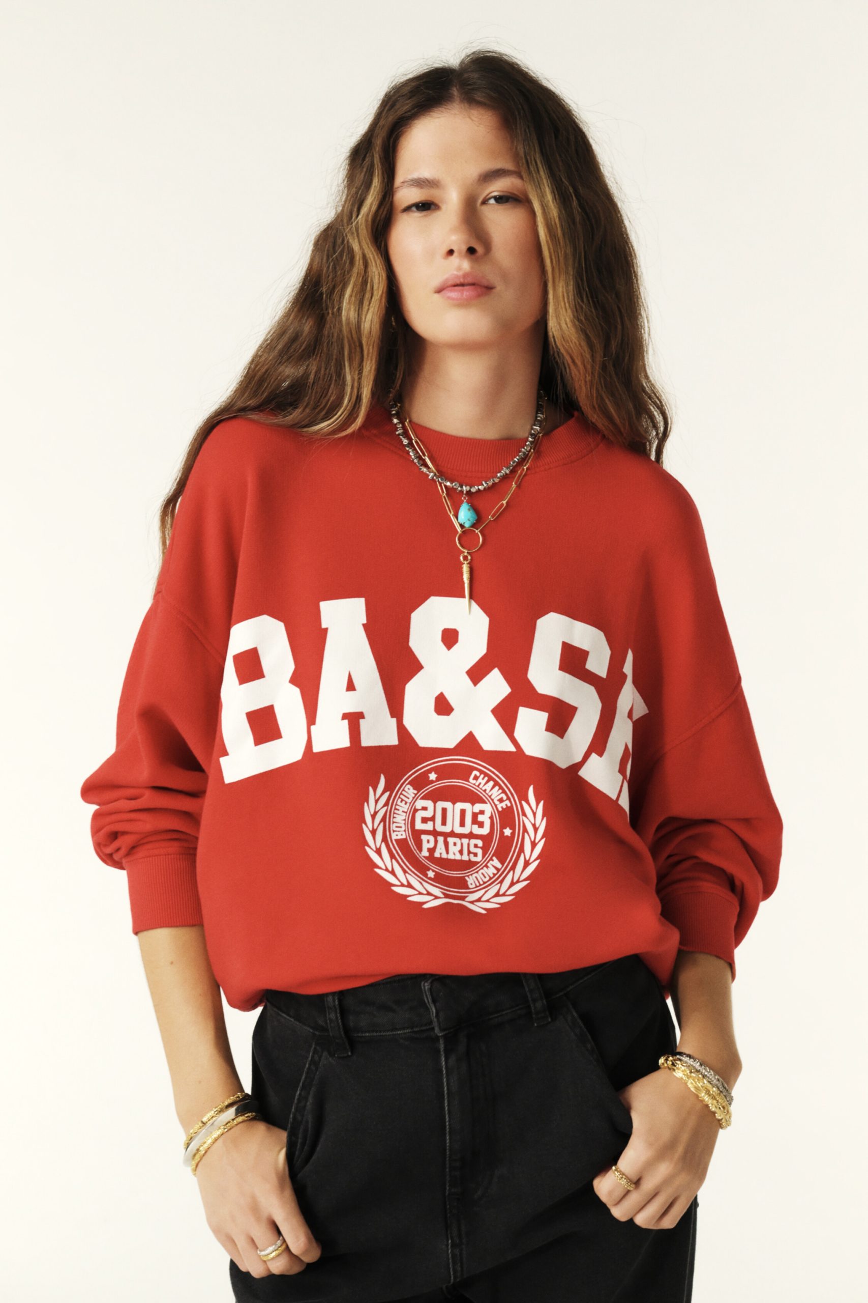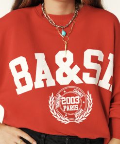 – Loose fit- Cropped length, just below the waist- Round neck- Long sleeves- Wide, dropped armholes- Ribbed neck, cuffs and hem trimAmerican University style- Menswear-inspired design- ba&sh logo on chest in large capitals- Happiness Chance Love mantra surrounding the Paris 2003 logo, underlined by laurel leaves- Made from cotton The cotton fibres in this garment are produced by organic farming.
