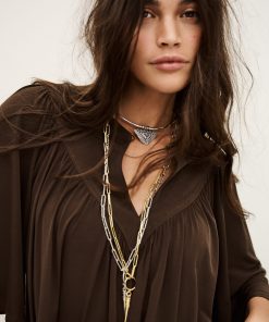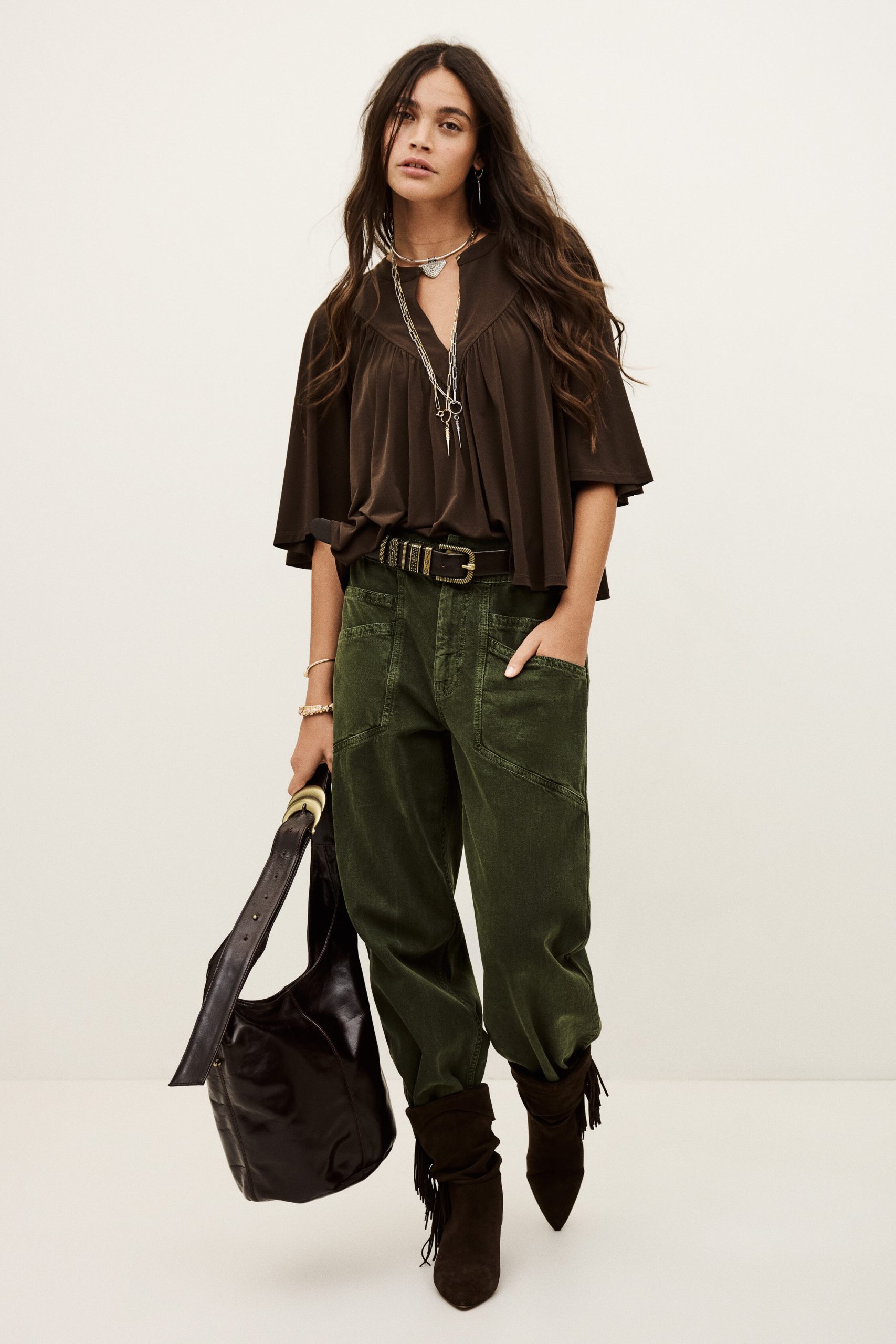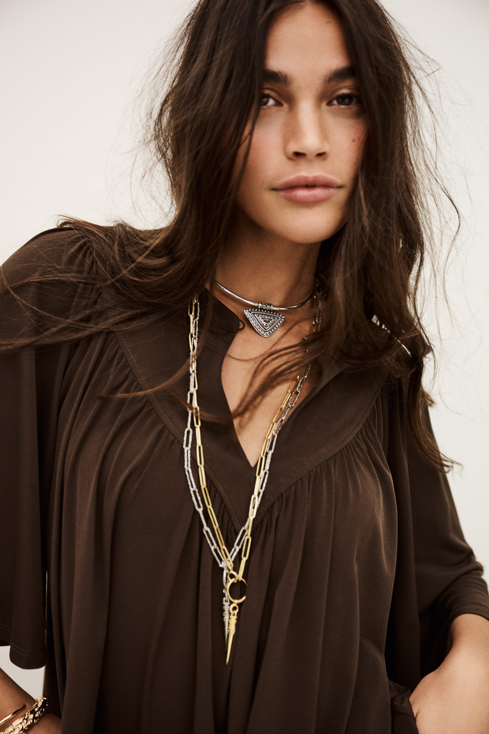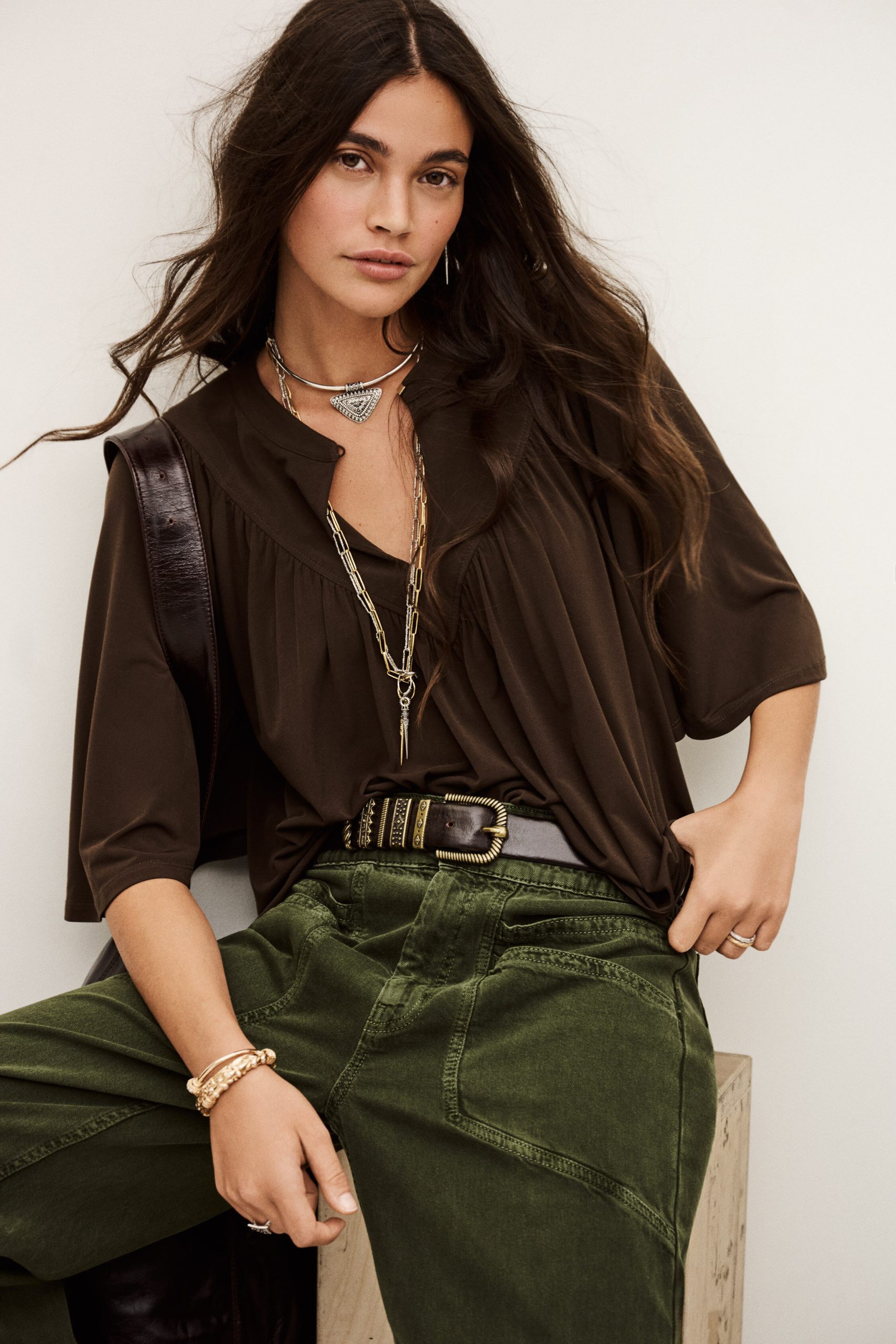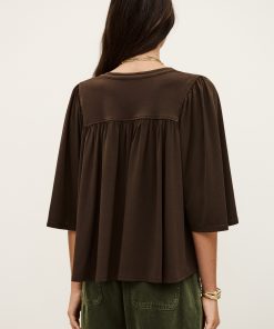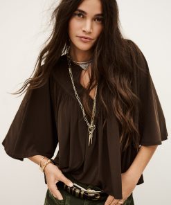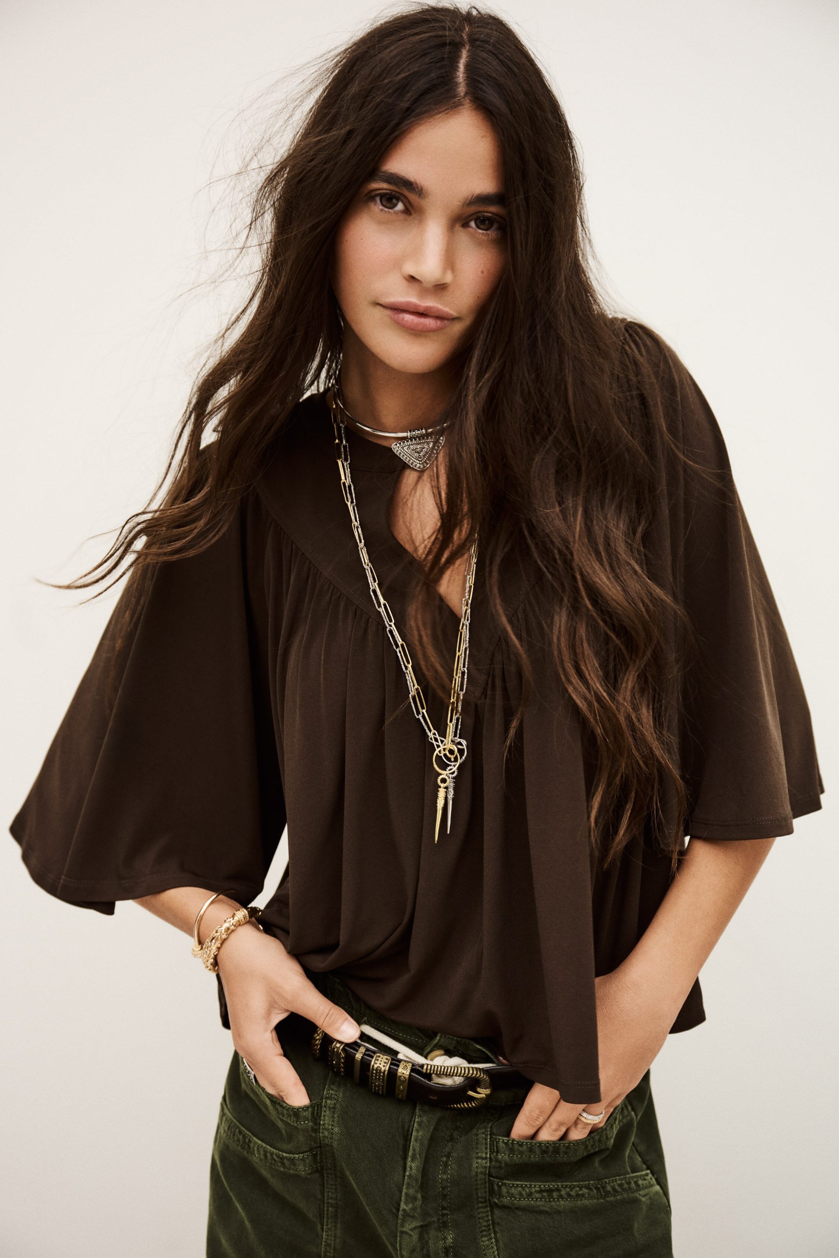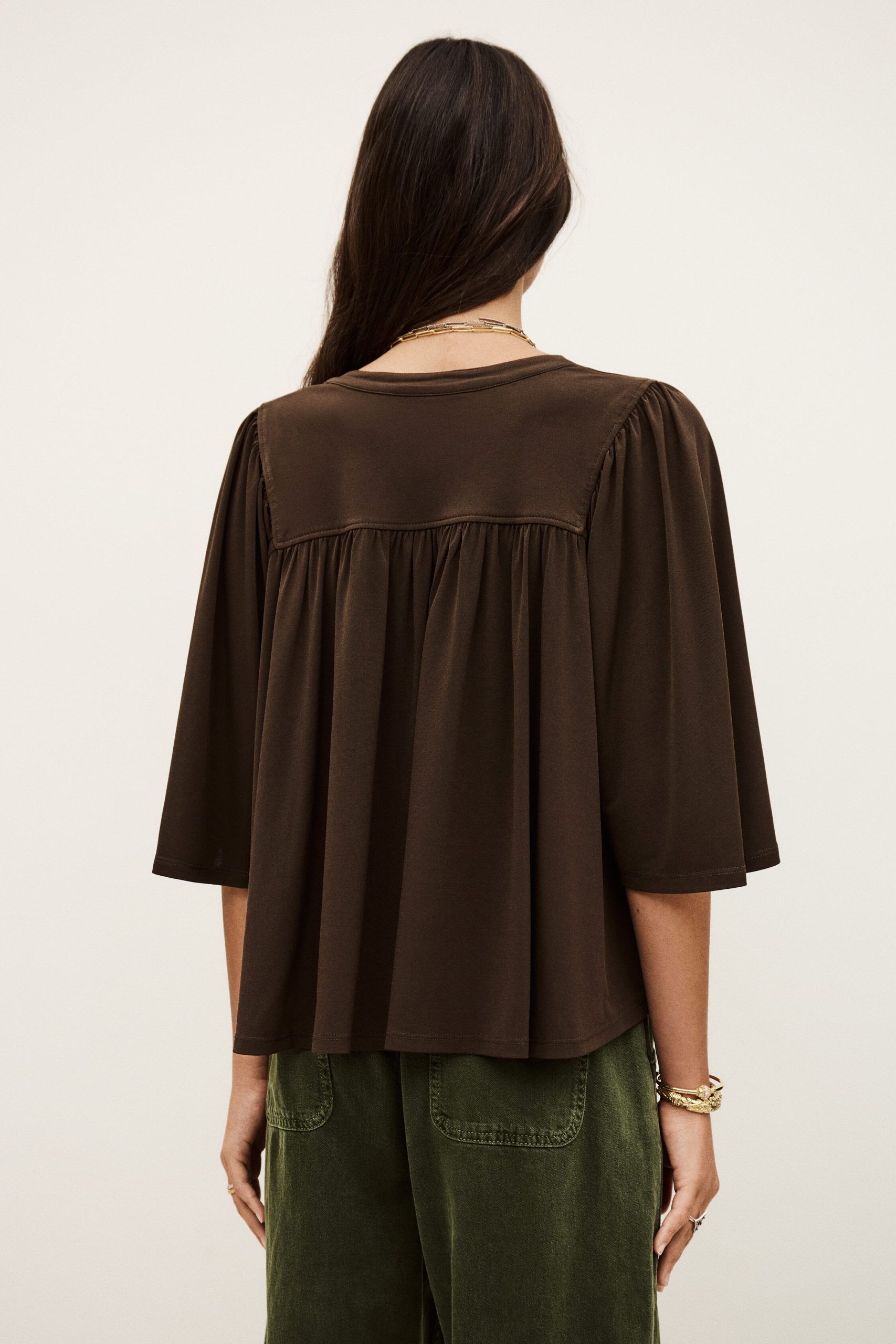 – Flared cut- Butterfly sleeves- V-shaped front bib- Gathers- Golden square jewel style button This model contains recycled synthetic fibers.