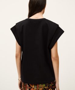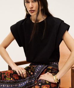 – Straight cut- Short sleeves- Boxy appearance shoulder pads- Round neckline- Turned-up sleeve bottoms