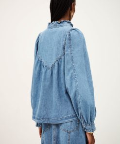 – Blouse style- Loose-fitting- Long puff sleeves- V-neckline- Frilly details- Gathers- Denim materialThe cotton fibers in this model come from organic farming.