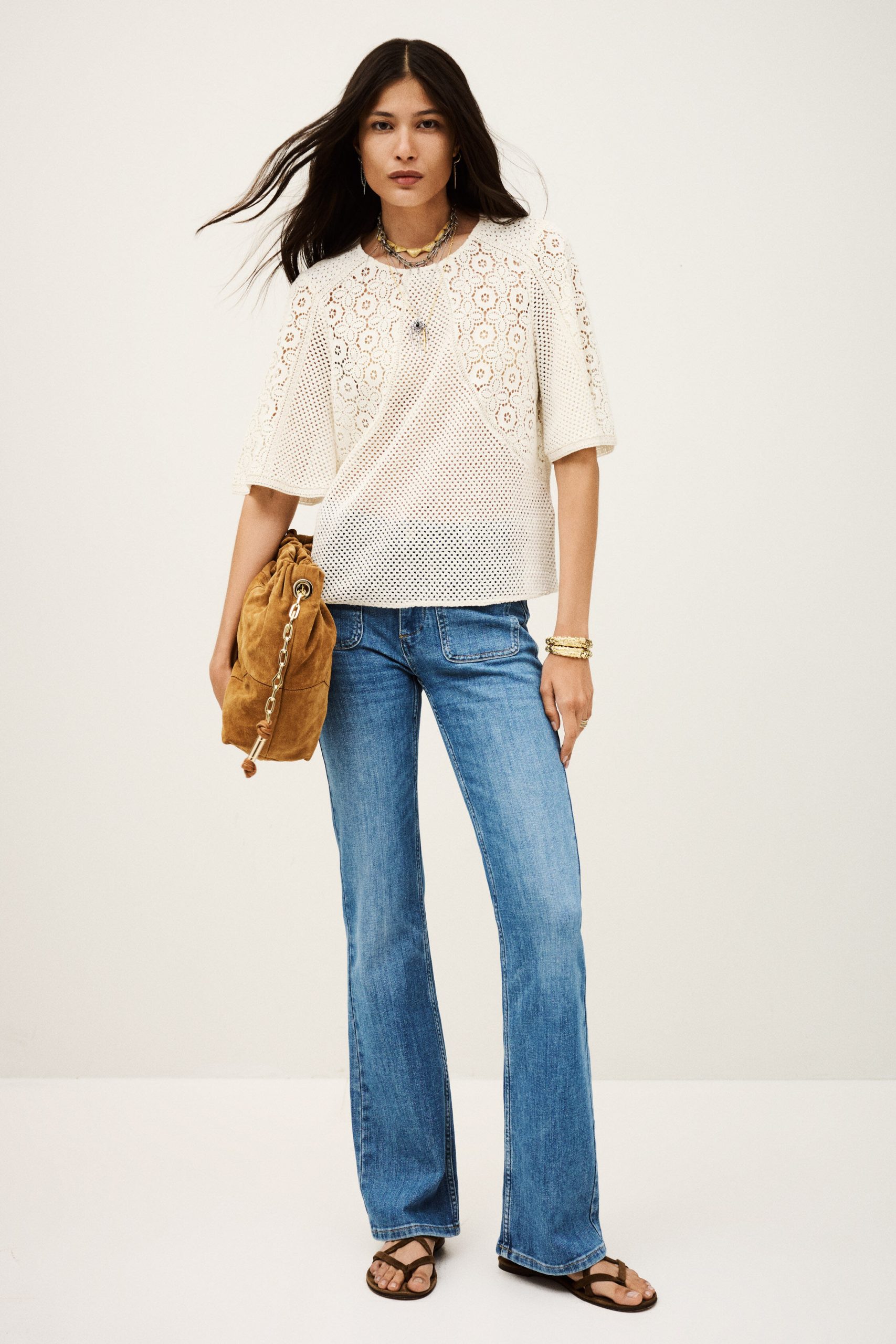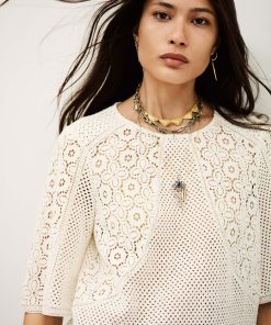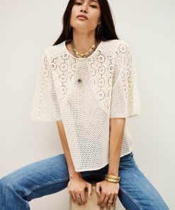 – Slightly flared sleeves- 2 lacy areas highlighted by an insert – Round neckline- Straight cut- Button tab in back with three buttons- ’70s style