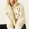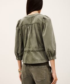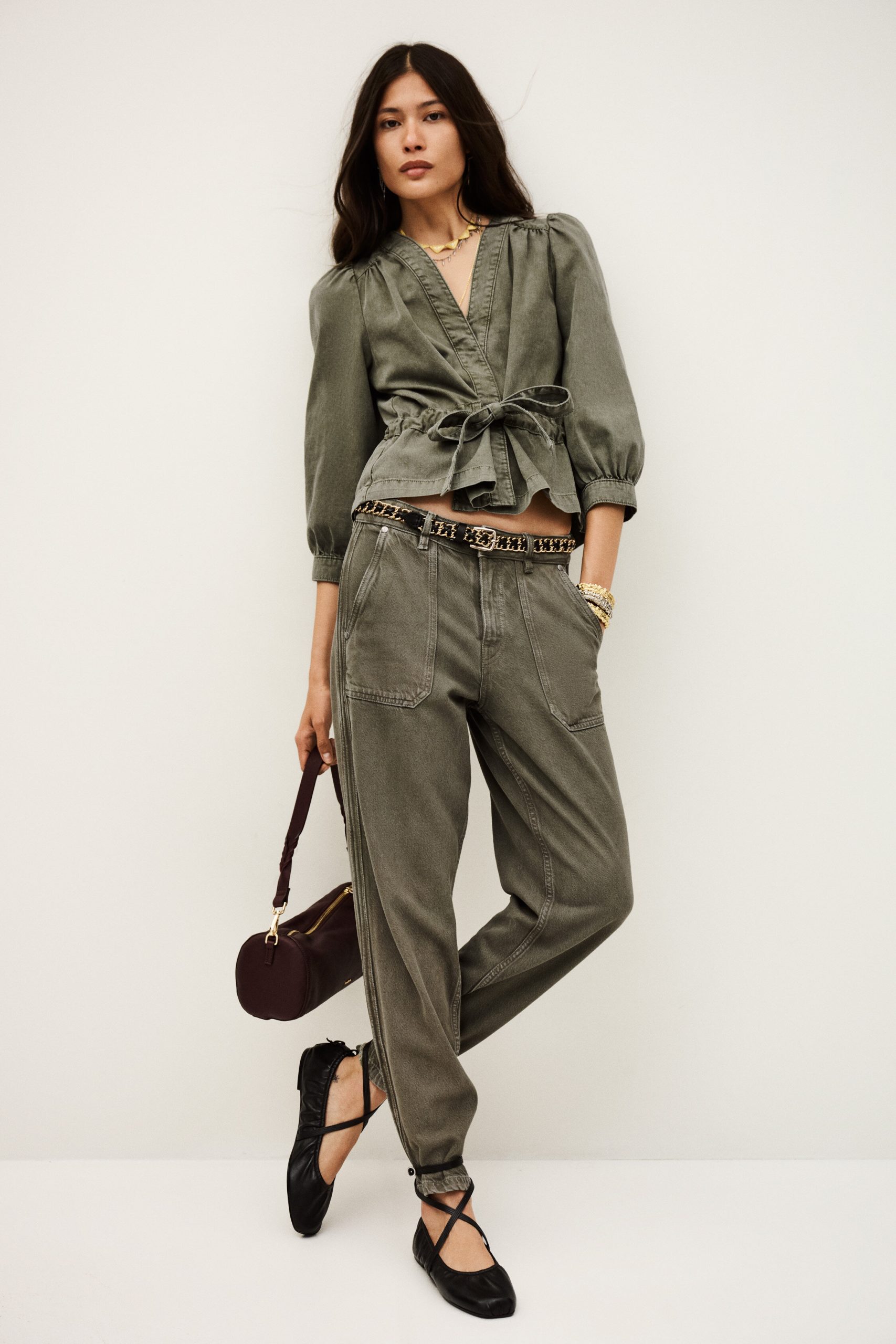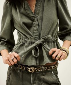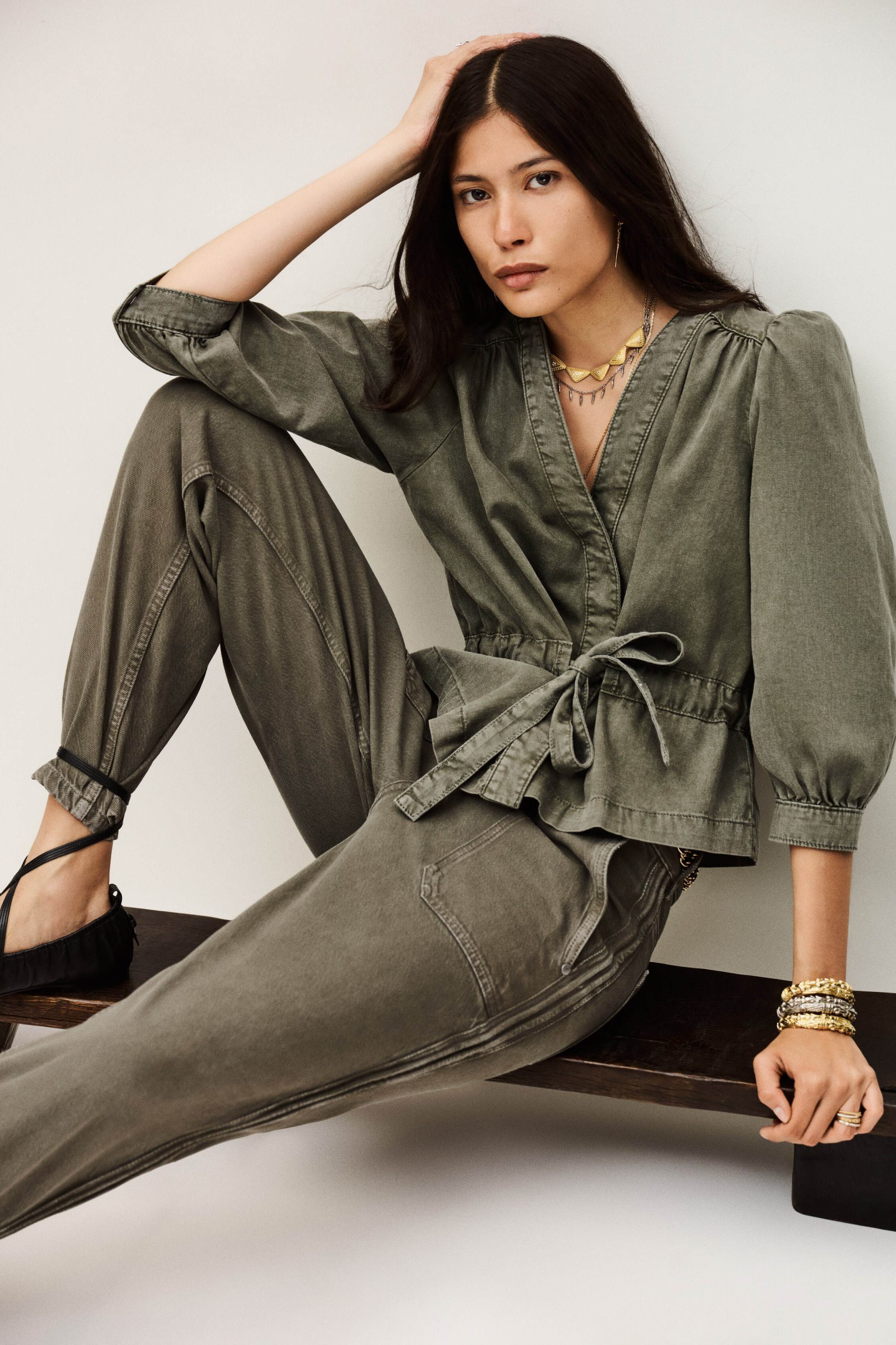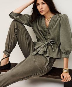 – Wrap style- 3/4 sleeves- V-neckline- Drawstring belt- Gathered sleeves- Soft denim materialThe cotton fibers in this model come from organic farming.