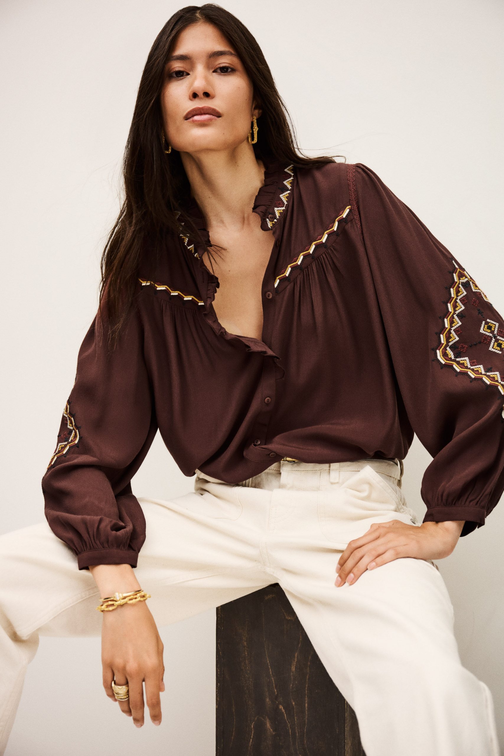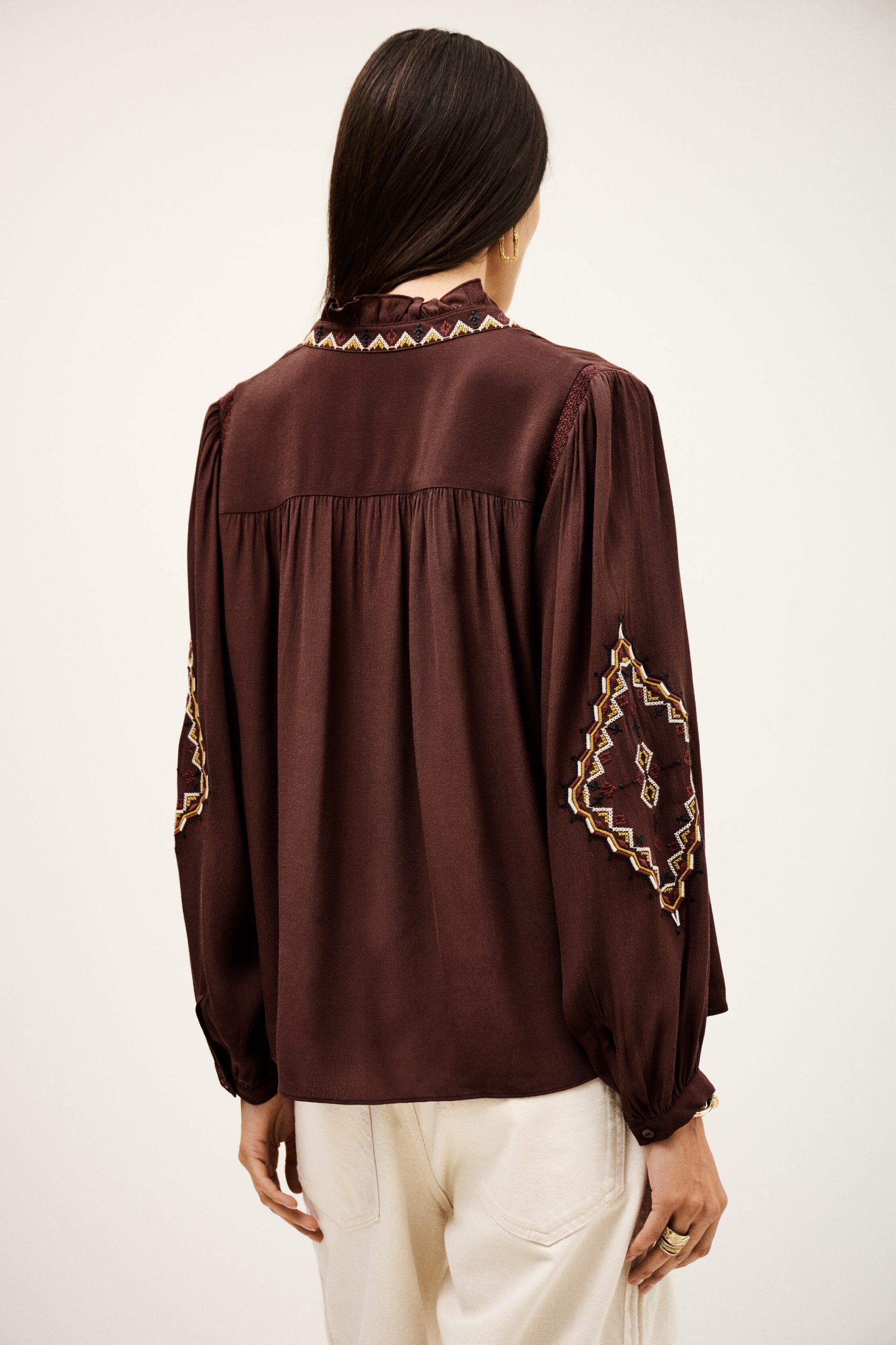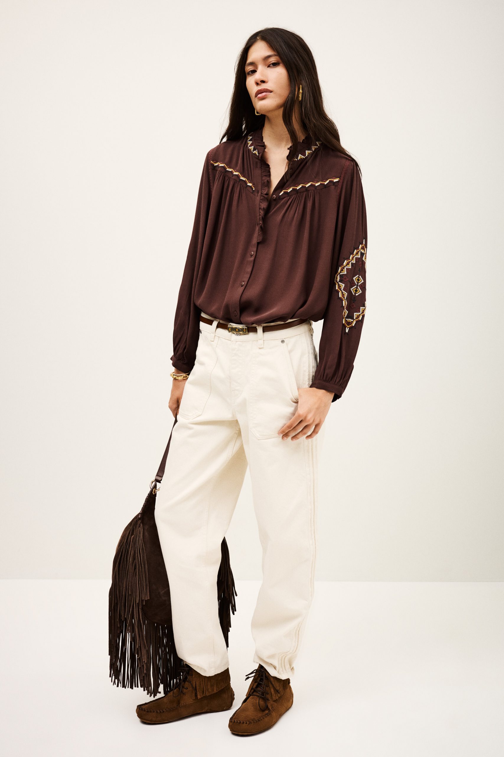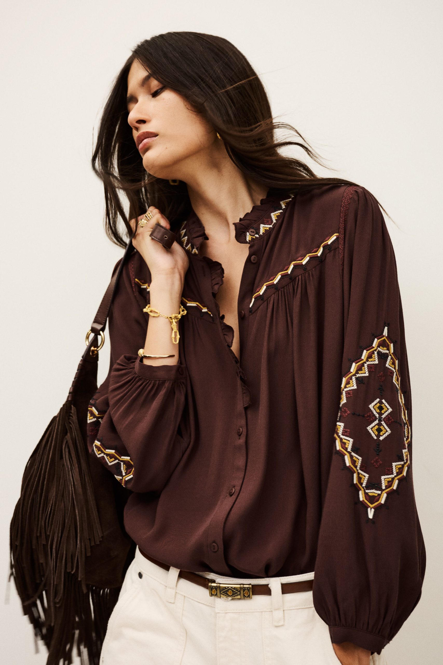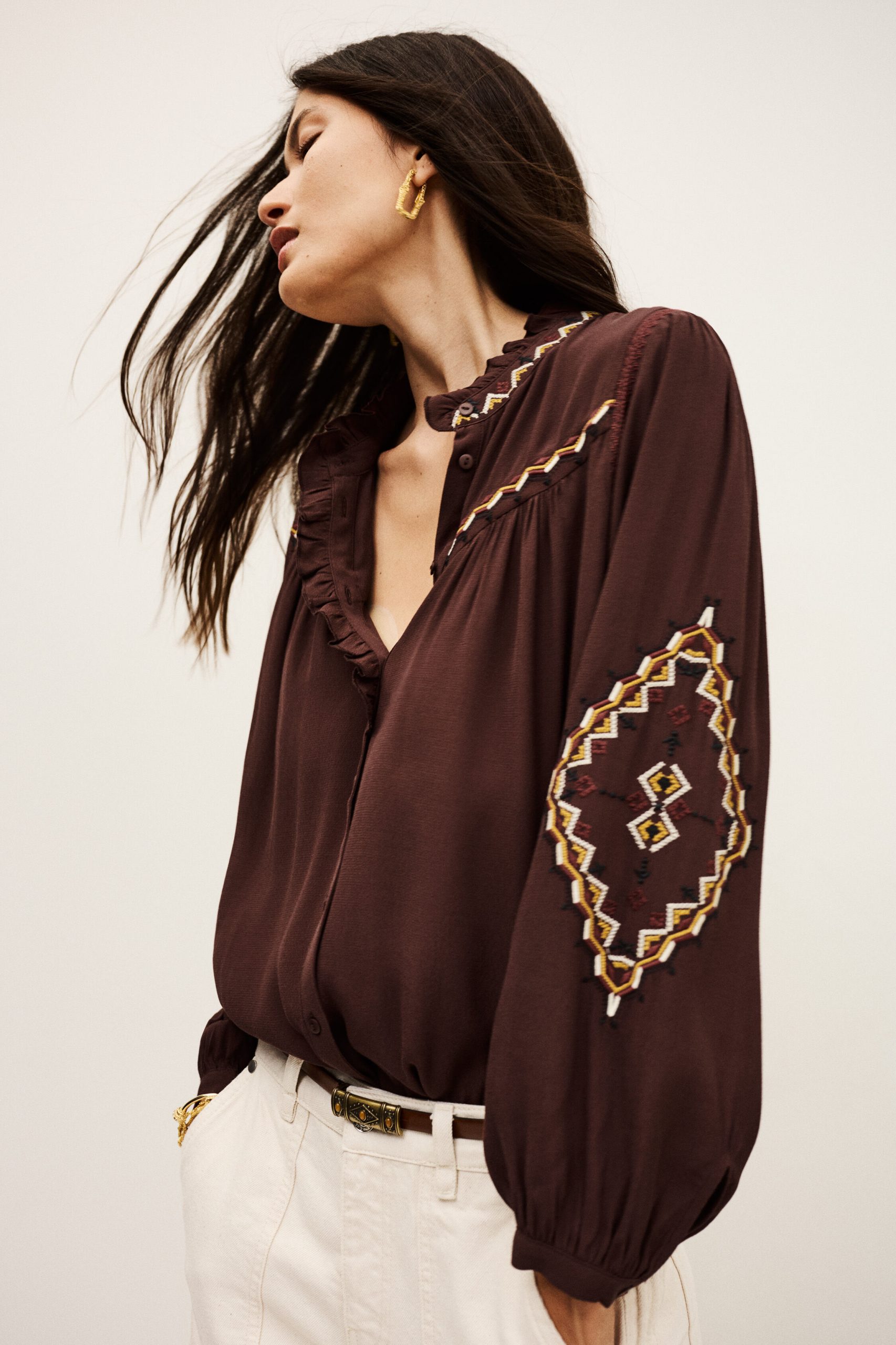 – Wide fit- Ruffled slit neckline- Button placket- Puff sleeves fitted at the wrists- Embroidered braid details on body and sleeves- Frilled dickey and diamonds with embroidered designThis model contains LENZING™ ECOVERO™ viscose, a fiber made from wood pulp from sustainably managed forests. LENZING™ and ECOVERO™ are trademarks of Lenzing AG.The viscose in this model is made from wood pulp from sustainably managed forests.
