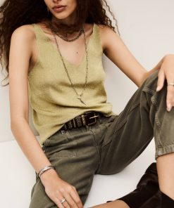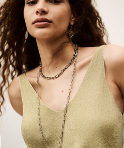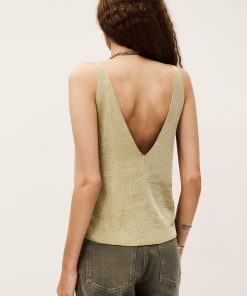 – Metallic knit- Low-cut V-neckline in back- Compact knit- Straight and flowingThe viscose in this model is made from wood pulp from sustainably managed forests.